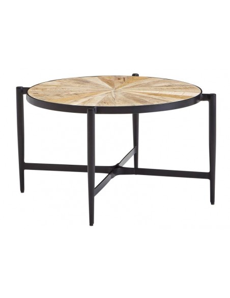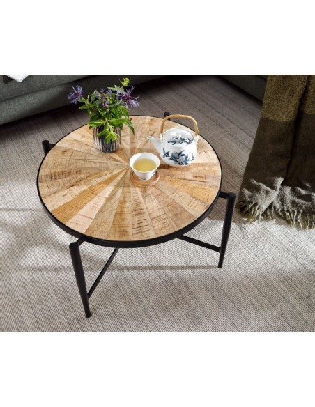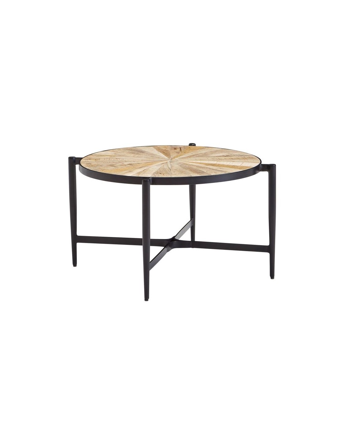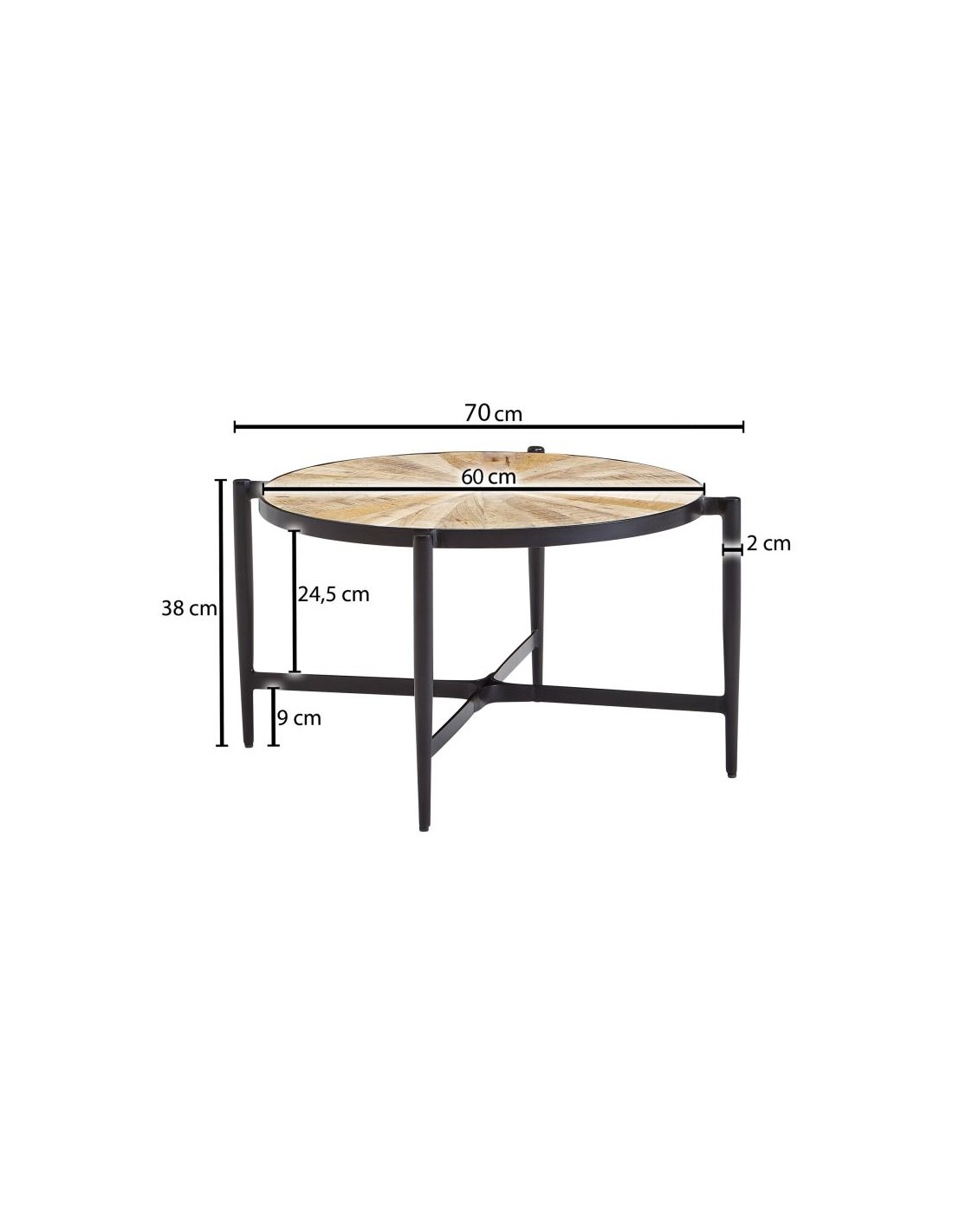 Sofabord fremstillet i et design af sortlakeret jern og naturfarvet mangotræ. Bordet måler 38 cm i højden og 70 cm i diameter.