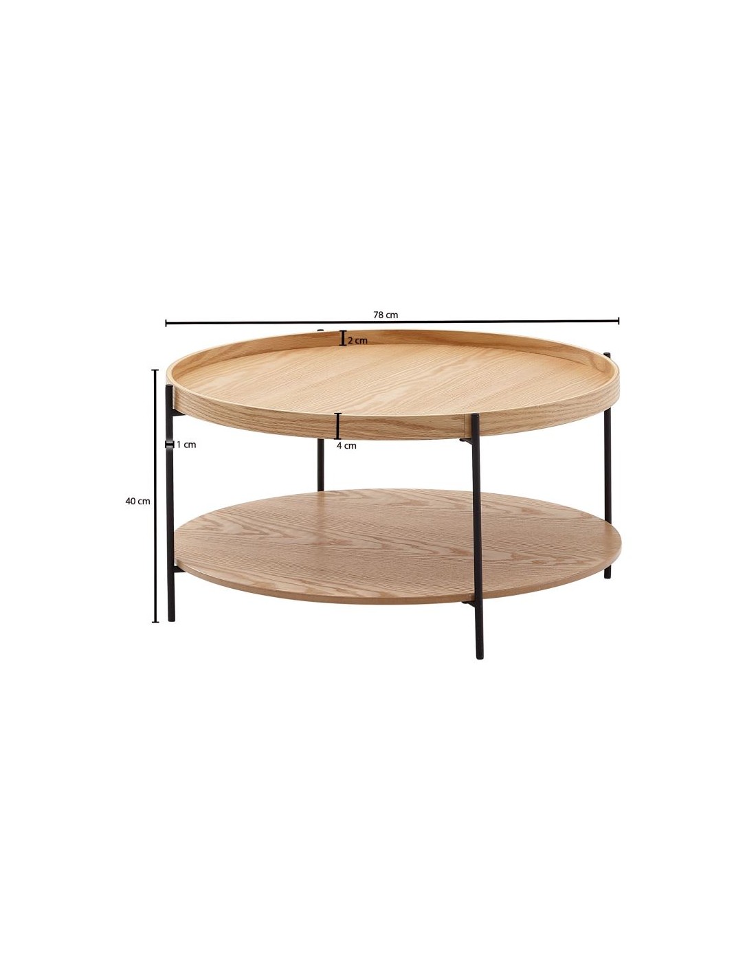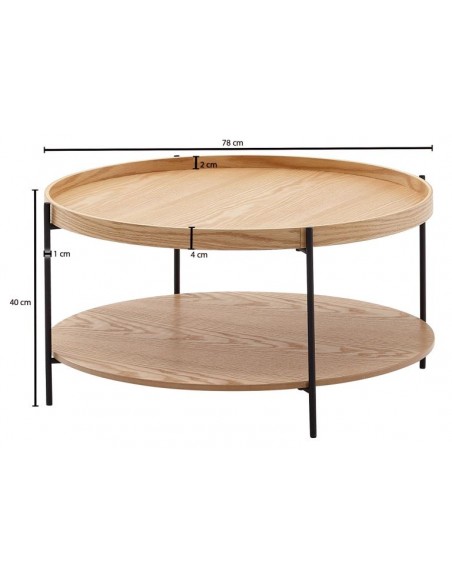 Sofabord fremstillet i et design af sortlakeret metal og egetræsfarvet finér. Bordet måler 40 cm i højden og 78 cm i diameter.