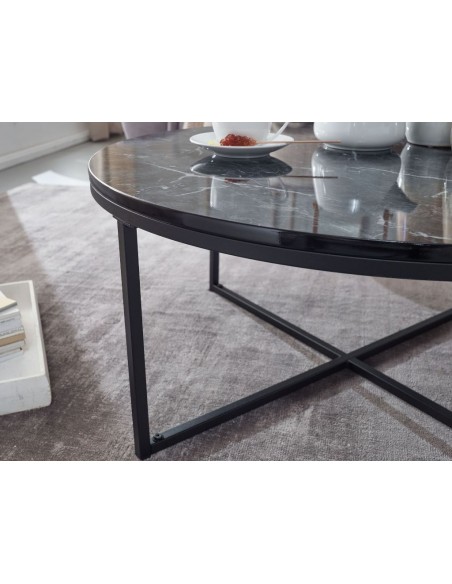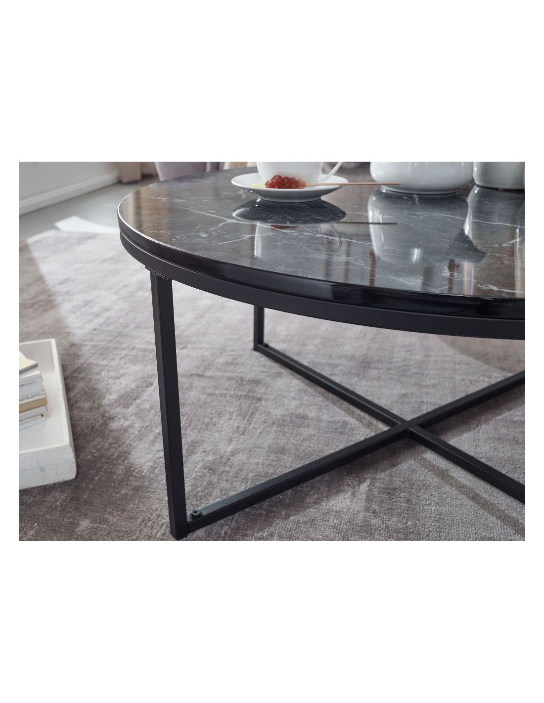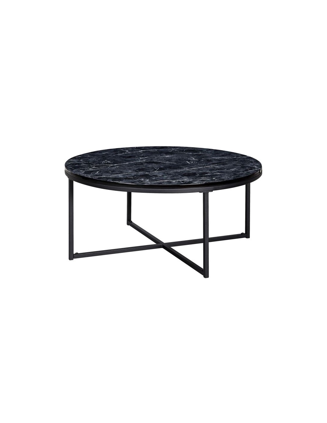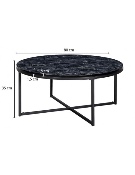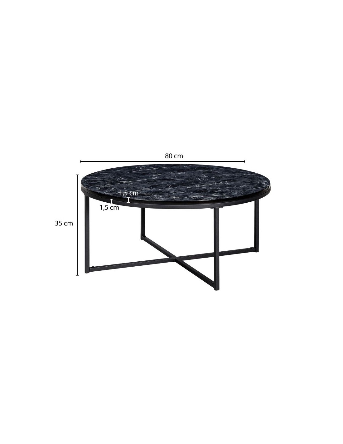 Sofabord fremstillet i sortlakeret metal og marmoriseret sort mdf. Bordet måler 35 cm i højden og 80 cm i diameter.