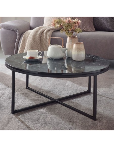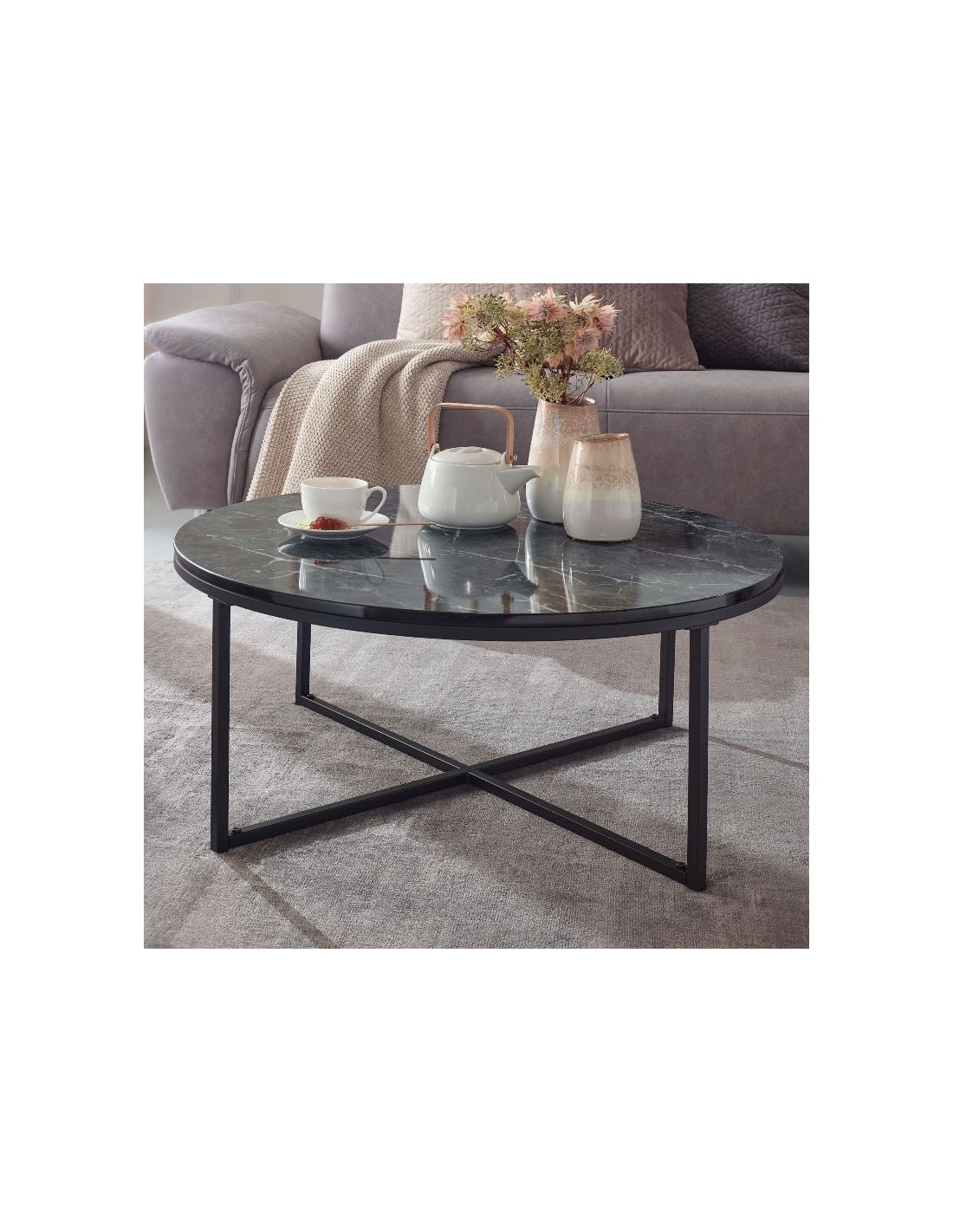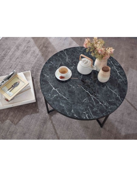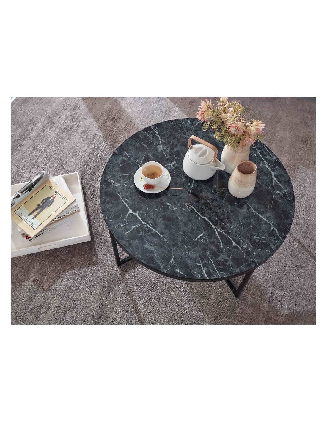 Sofabord i metal og mdf Ø80 cm - Sort/Marmoriseret sort