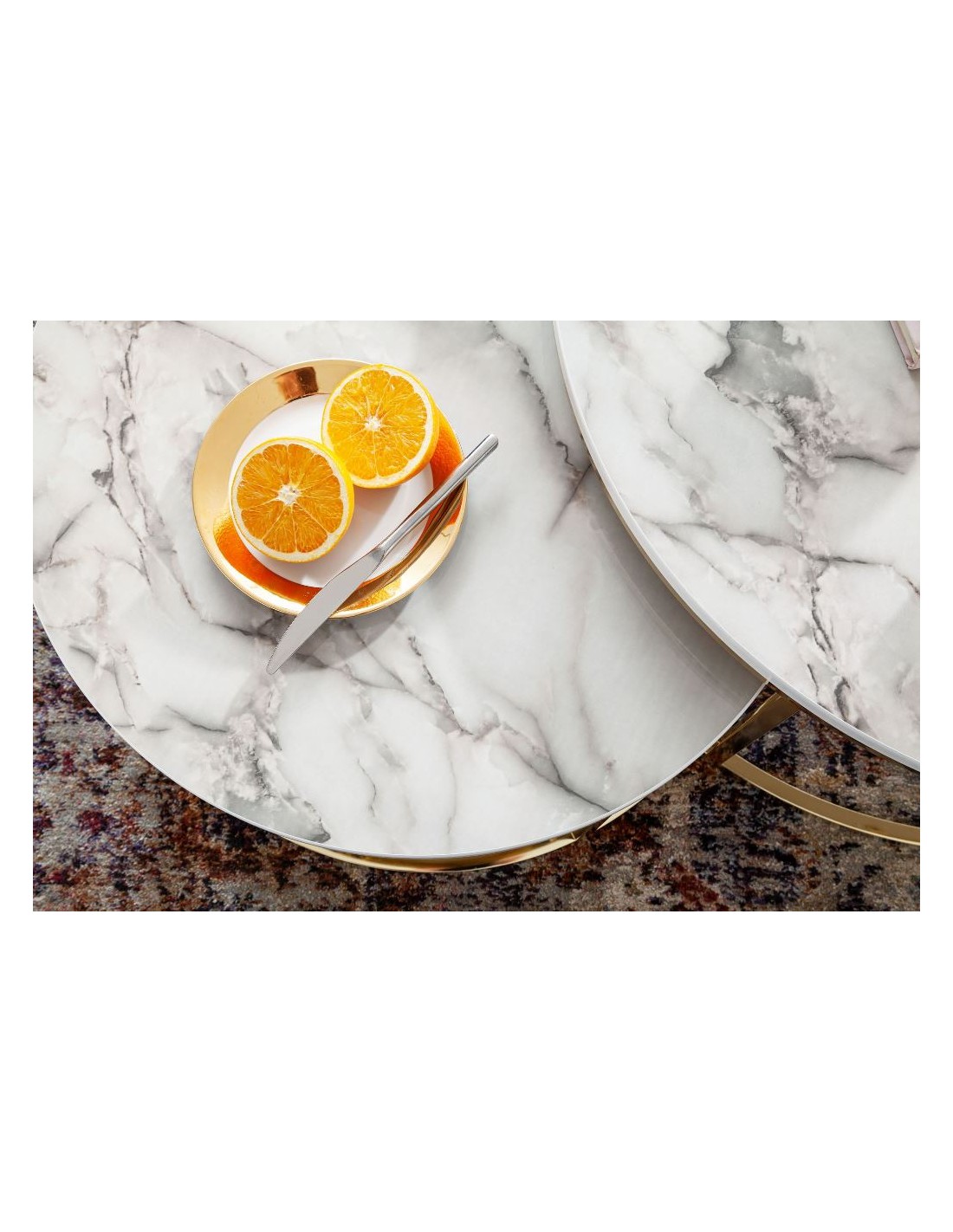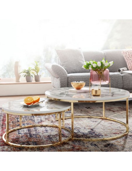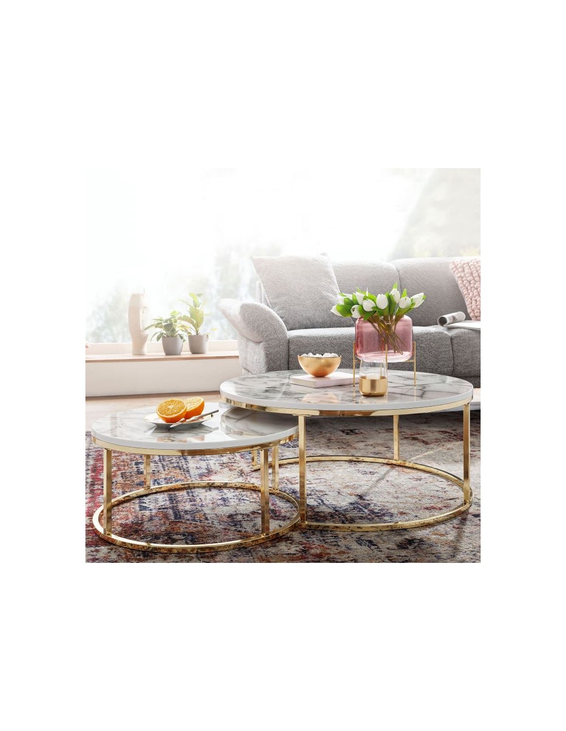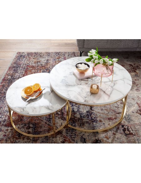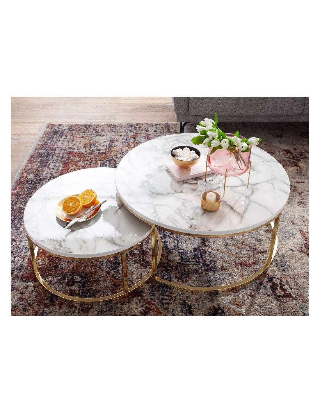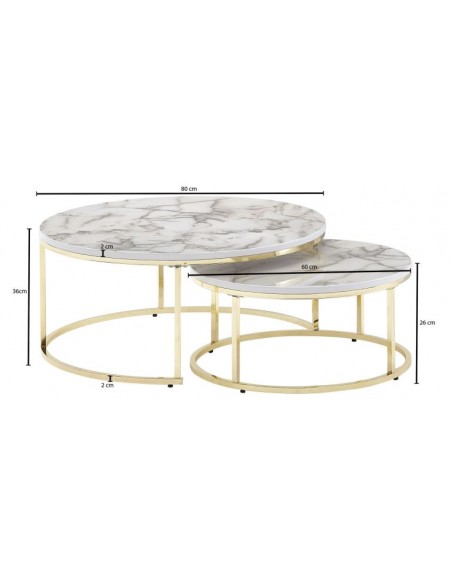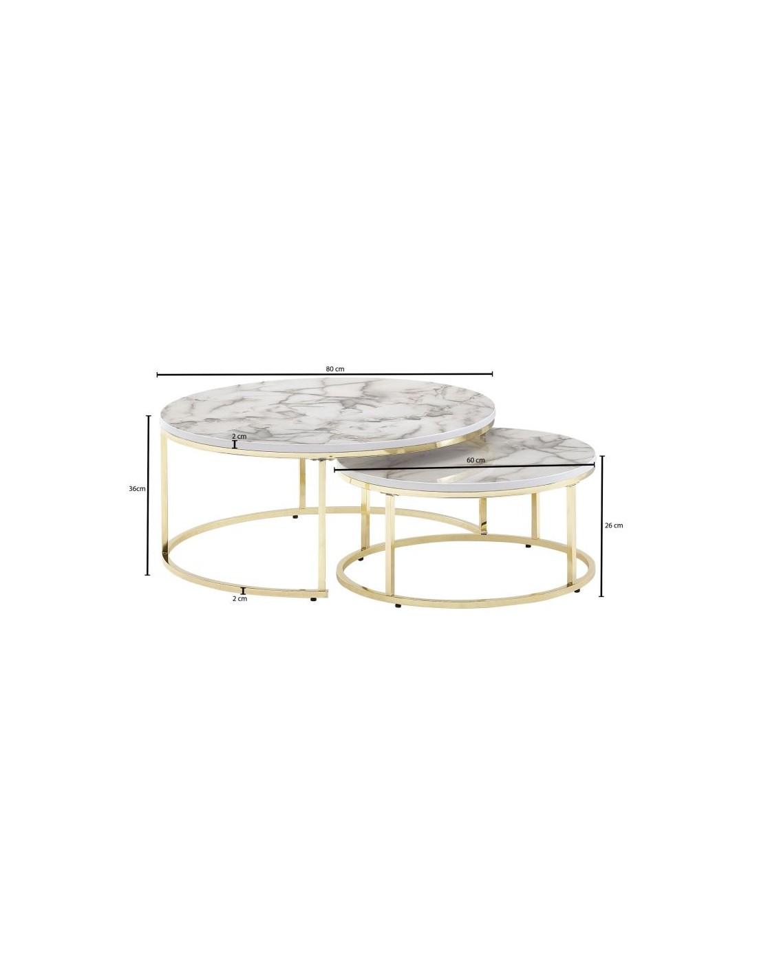 Sæt med 2 sofaborde, fremstillet i guldfarvet metal og marmoriseret hvid mdf. Bordene måler 60 + 80 cm i diameter og 26 + 36 cm i højden.