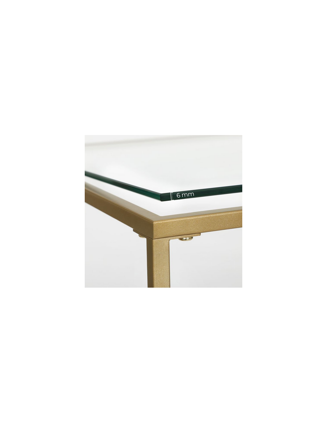 Sofabord udført i et design af guldfarvet metal og klart glas. Sofabordet måler 55 cm i højden og 45,5 x 45,5 cm i bredde og dybde.