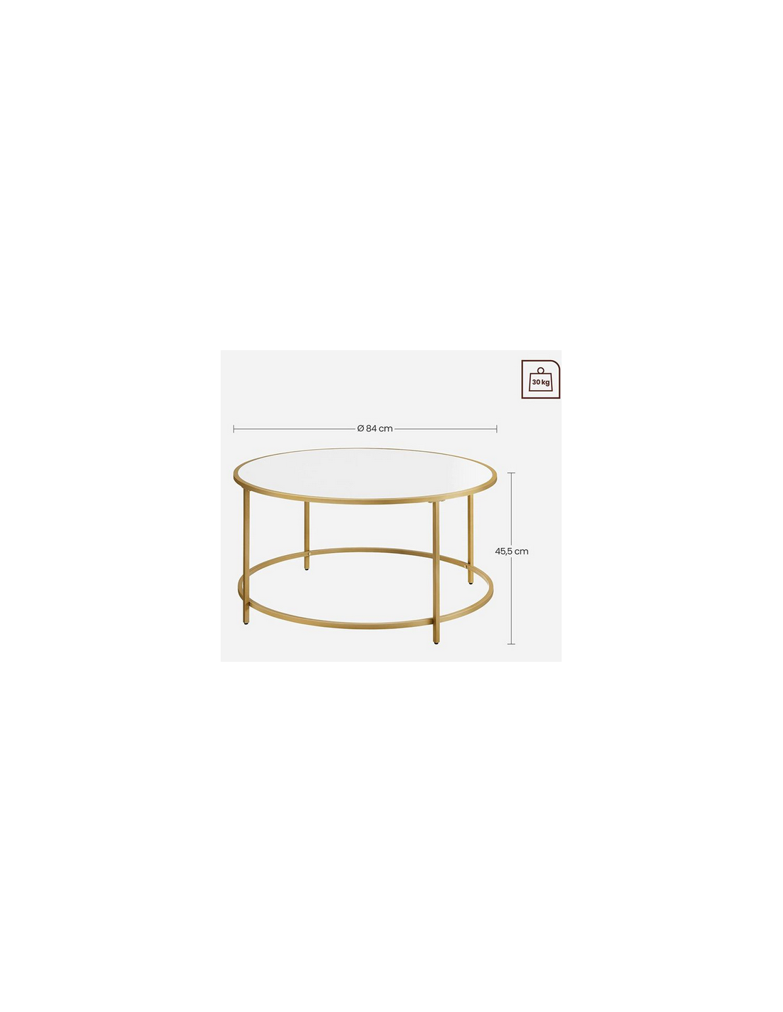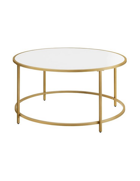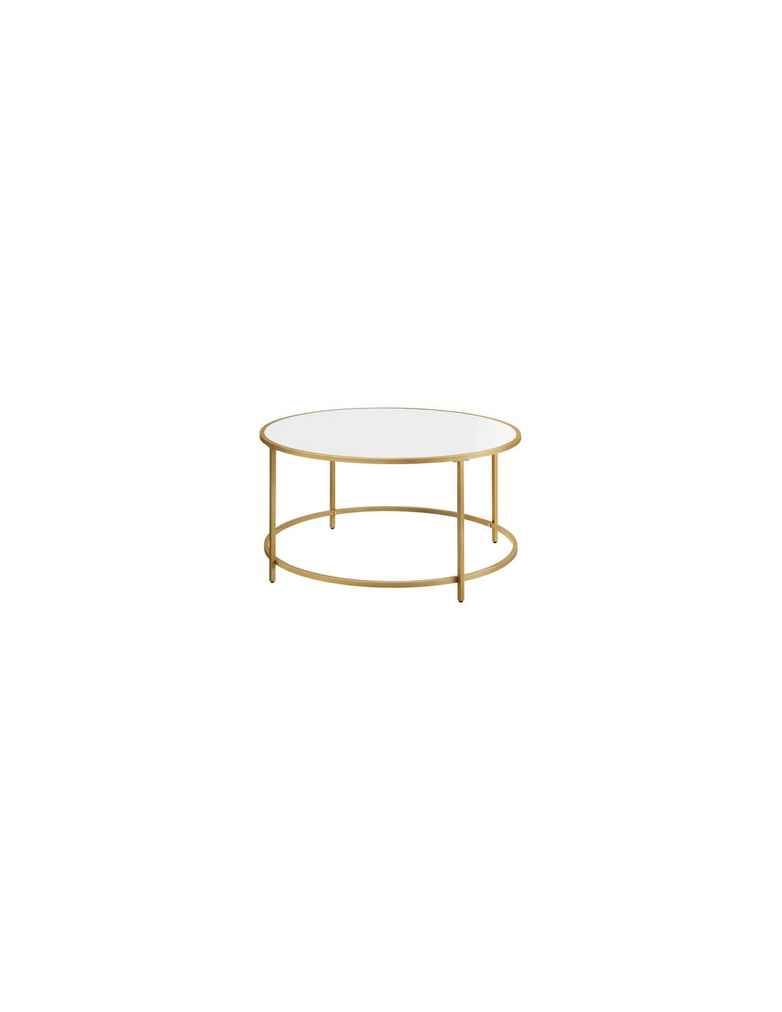 Sofabord udført i et design af guldfarvet metal og hvid møbelplade. Sofabordet måler 45,5 cm i højden og 84 cm i diameter.