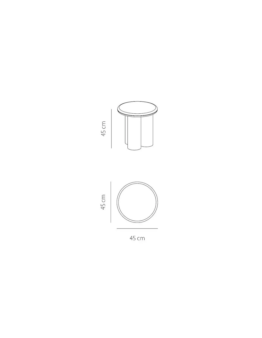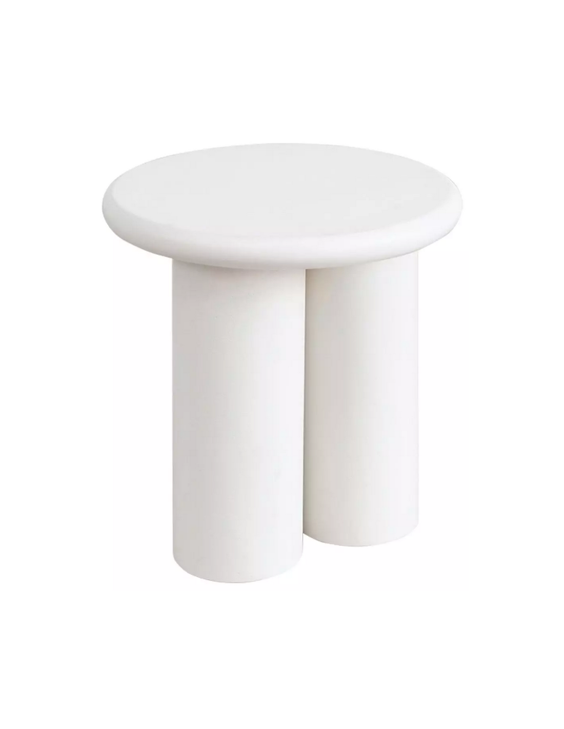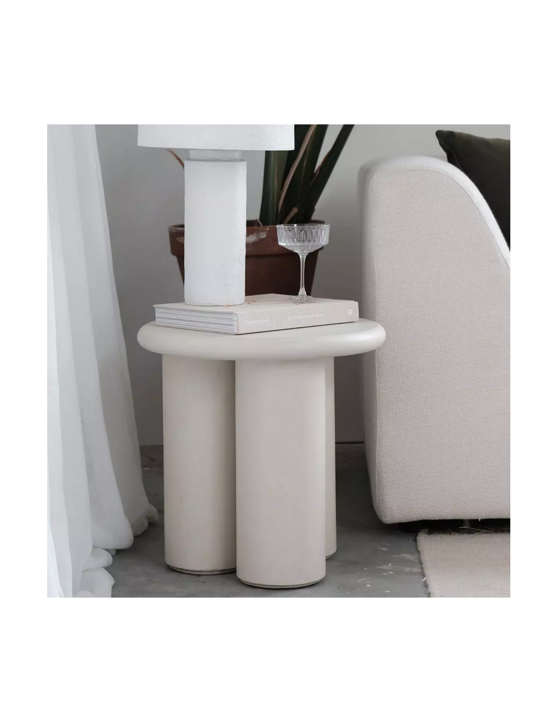Sofabord udført i et moderne design af råhvid mortex. Sofabordet måler 45 cm i højden og 45 cm i diameter. Mortex er en blanding af mineraler og beton, der gør det muligt at fremstille et bord med organiske former, samtidig med at overfladen er gjort vandafvisende.