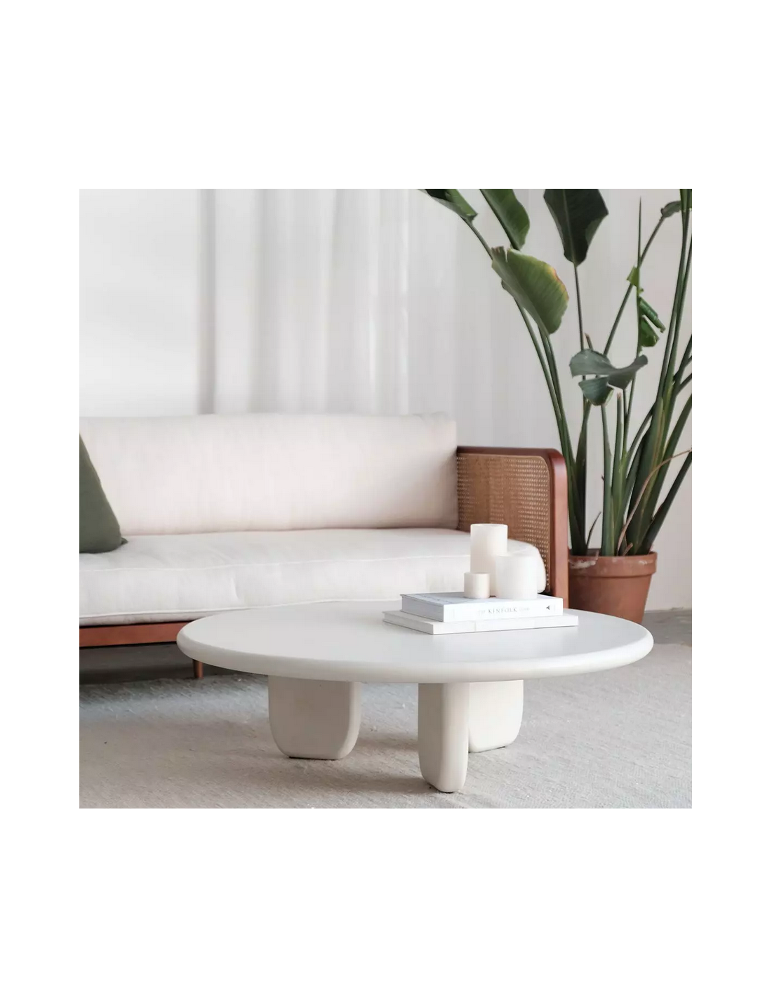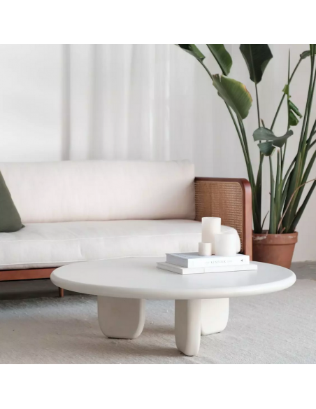 Sofabord udført i et moderne design af råhvid mortex. Sofabordet måler 30 cm i højden og 100 cm i diameter. Mortex er en blanding af mineraler og beton, der gør det muligt at fremstille et bord med organiske former, samtidig med at overfladen er gjort vandafvisende.