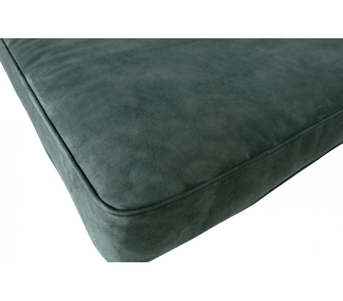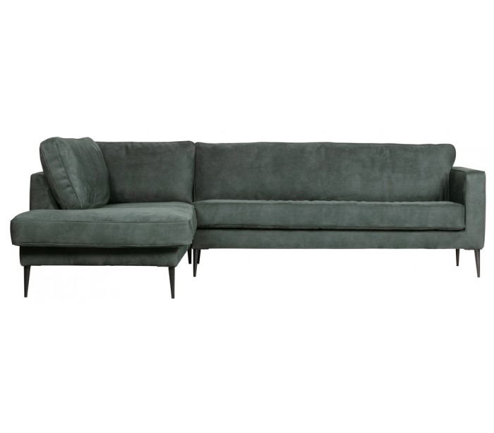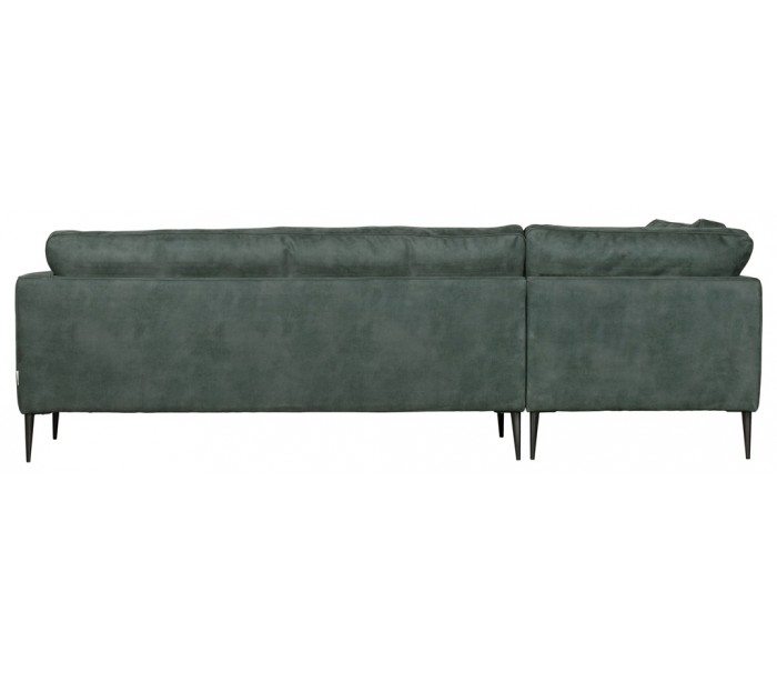 Moderne hjørnesofa i venstrevendt udgave, udført i et flot design af petroliumsfarvet polyester med ruskindslook, og ben i sortlakeret metal. Sofaen måler 275 x 215 cm i bredde og dybde og er polstret med højkvalitets skum.