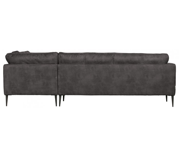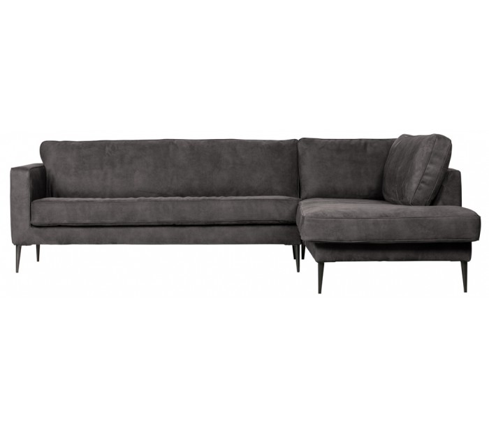 Moderne hjørnesofa i højrevendt udgave, udført i et flot design af mørkegrå polyester med ruskindslook, og ben i sortlakeret metal. Sofaen måler 275 x 215 cm i bredde og dybde og er polstret med højkvalitets skum.