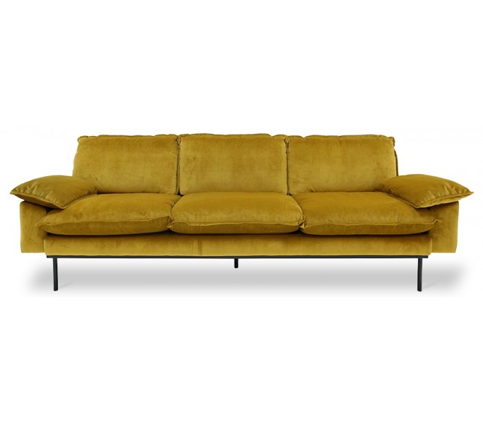 Moderne 4-personers sofa udført i et flot design af okkerfarvet velour og ben i sortlakeret metal. Sofaen måler 245 cm i bredde og 94 cm i dybde og er polstret med fjedre og højkvalitets skum.