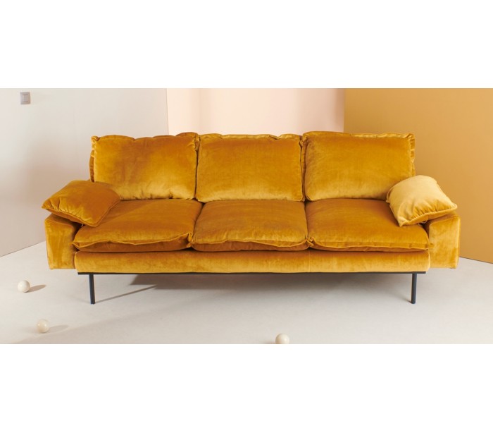 Moderne 3-personers sofa udført i et flot design af okkerfarvet velour og ben i sortlakeret metal. Sofaen måler 225 cm i bredde og 94 cm i dybde og er polstret med fjedre og højkvalitets skum.