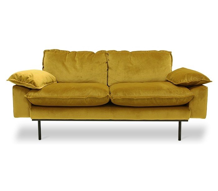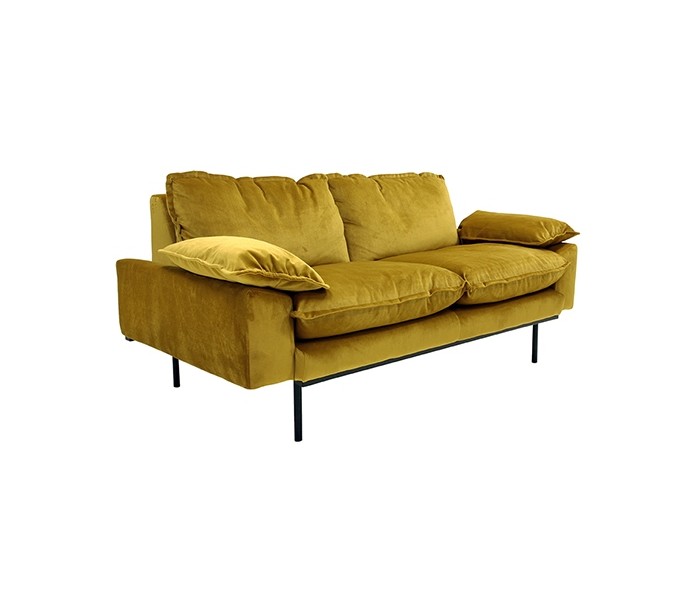 Moderne 2-personers sofa udført i et flot design af okkerfarvet velour og ben i sortlakeret metal. Sofaen måler 175 cm i bredde og 94 cm i dybde og er polstret med fjedre og højkvalitets skum.