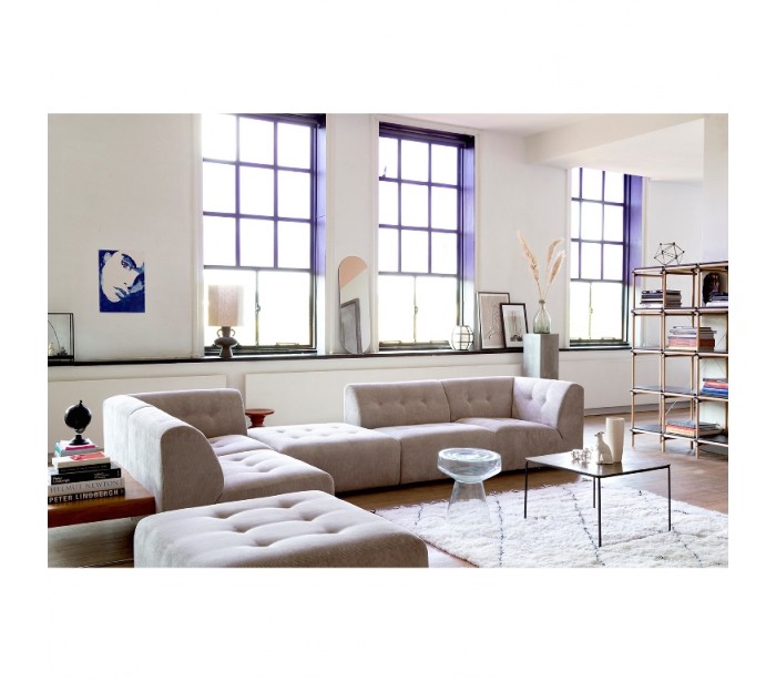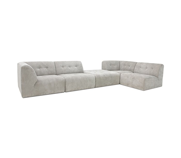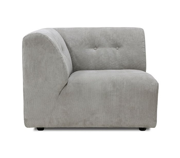 Moderne hjørnemodul udført i et flot design af cremefarvet corduroy ribcurl (92% Polyester/8% Akryl) og ben i sort plast. Sofamodulet måler 95 cm i bredde og 95 cm i dybde og er polstret med no-sag fjedre og højkvalitets skum. Modulerne kan forbindes via klemmer.