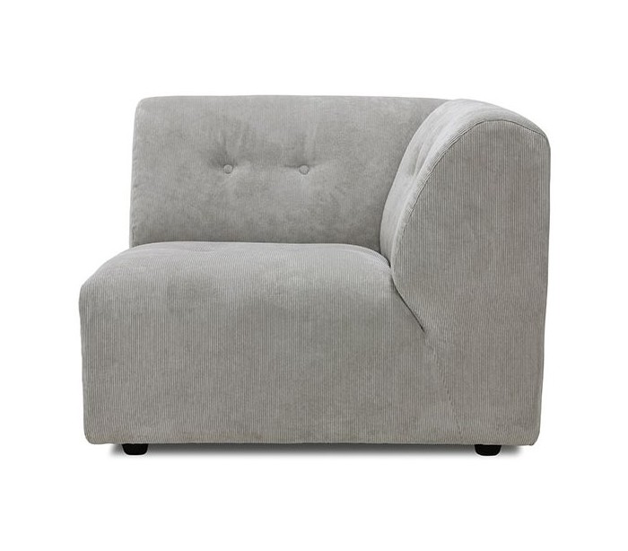 Moderne hjørnemodul udført i et flot design af cremefarvet corduroy ribcurl (92% Polyester/8% Akryl) og ben i sort plast. Sofamodulet måler 95 cm i bredde og 95 cm i dybde og er polstret med no-sag fjedre og højkvalitets skum. Modulerne kan forbindes via klemmer.
