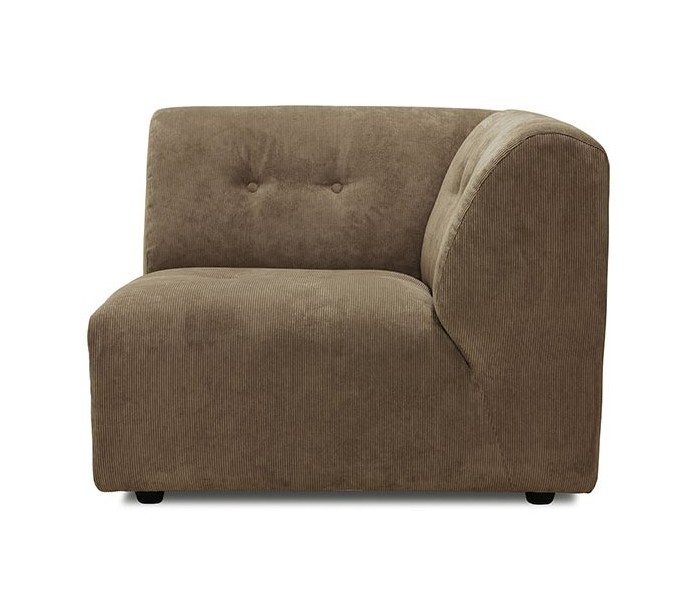Moderne hjørnemodul udført i et flot design af brun corduroy ribcurl (92% Polyester/8% Akryl) og ben i sort plast. Sofamodulet måler 95 cm i bredde og 95 cm i dybde og er polstret med no-sag fjedre og højkvalitets skum. Modulerne kan forbindes via klemmer.