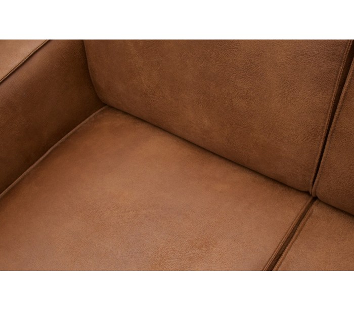 Moderne hjørnesofa i et flot udført design af vintage cognac læder. Sofaen måler 274 x 210 cm i bredde og dybde, og med en siddehøjde på 42 cm. Sofaen er polstret med højkvalitets skum og fjedre. Sofaen fremstår i et look af ruskind.