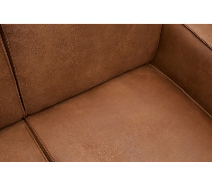 Moderne hjørnesofa i et flot udført design af vintage cognacfarvet læder. Sofaen måler 274 x 210 cm i bredde og dybde, og med en siddehøjde på 42 cm. Sofaen er polstret med højkvalitets skum og fjedre. Sofaen fremstår i et look af ruskind.