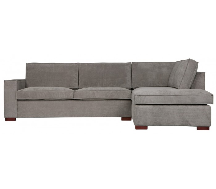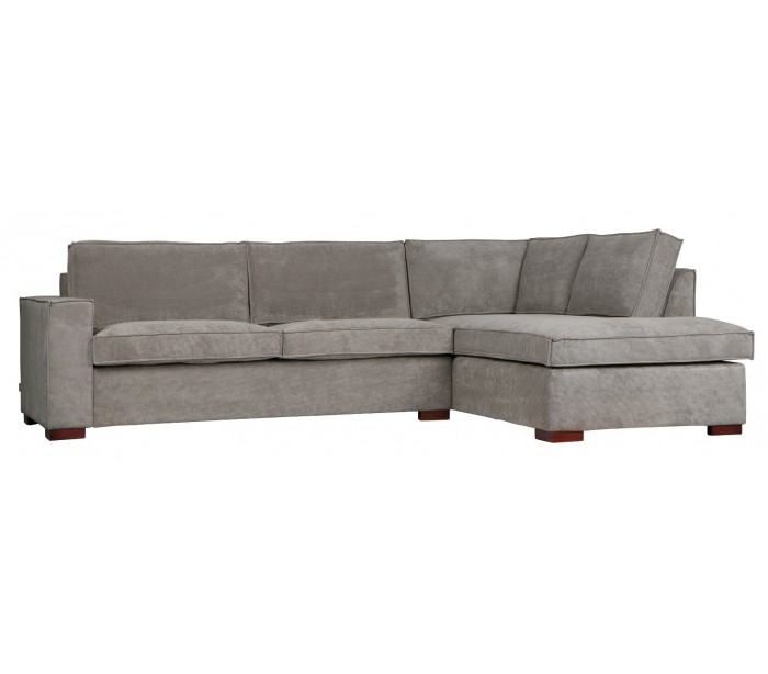 Moderne hjørnesofa med chaiselong i et flot design af gråt tekstil og med ben i massiv træ. Sofaen måler 283 x 197 cm. Sofaen er polstret med højkvalitets skum og nosag fjedre.