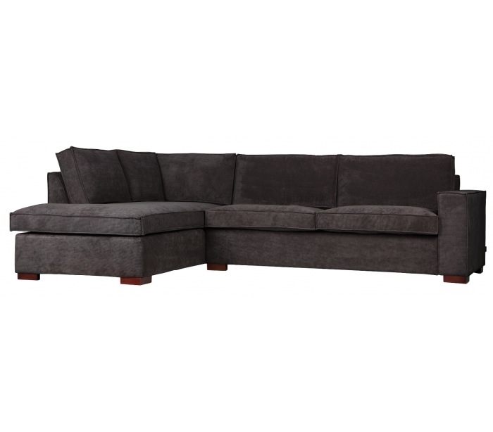 Moderne hjørnesofa med chaiselong i et flot design af mørkegråt tekstil og med ben i massiv træ. Sofaen måler 283 x 197 cm. Sofaen er polstret med højkvalitets skum og nosag fjedre.