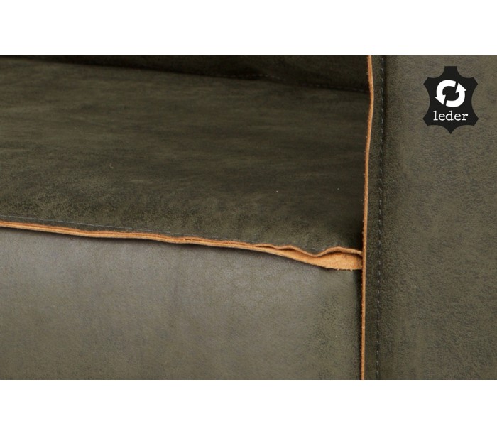 Moderne hjørnesofa i højrevendt udgave, udført i et flot design af vintage armygrøn læder. Sofaen måler 266 x 213 cm i bredde og dybde og er polstret med højkvalitets skum.
