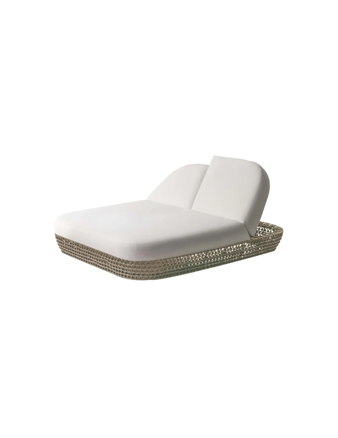 Dobbelt solseng udført i et design af beige syntetisk rattan med stel af aluminium og med tykke komfortable hynder i taupefarvet vandafvisende olefin (vandafvisende, ikke vandtæt). Solsengen har flere indstillinger for ryggen. Solsengen tåler at stå ude hele sommeren og er resistent overfor regn og fugt.