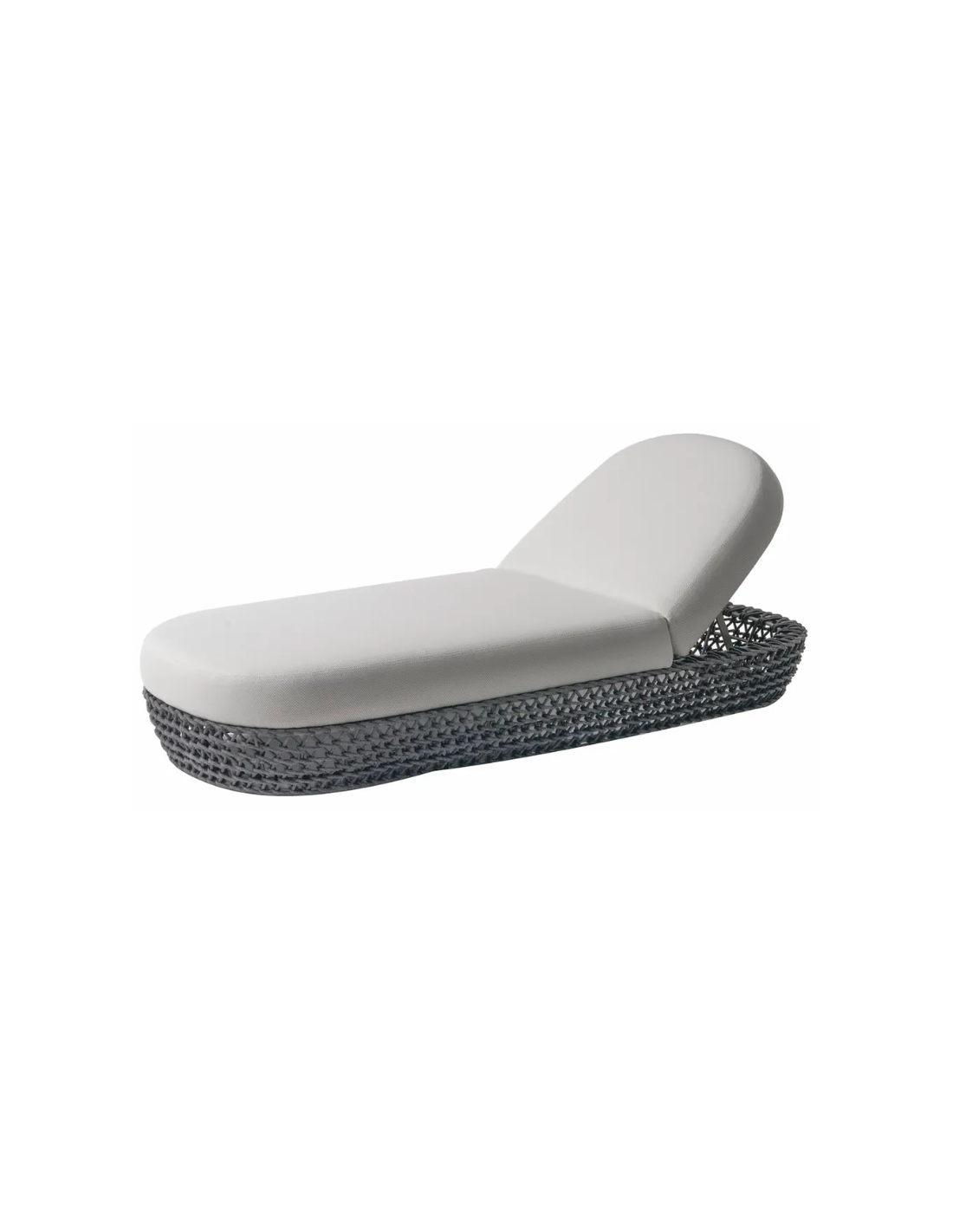 Solseng udført i et design af antracitfarvet syntetisk rattan med stel af aluminium og med tykke komfortable hynde i duegråt vandafvisende olefin (vandafvisende, ikke vandtæt). Solsengen har flere indstillinger for ryggen. Solsengen tåler at stå ude hele sommeren og er resistent overfor regn og fugt.