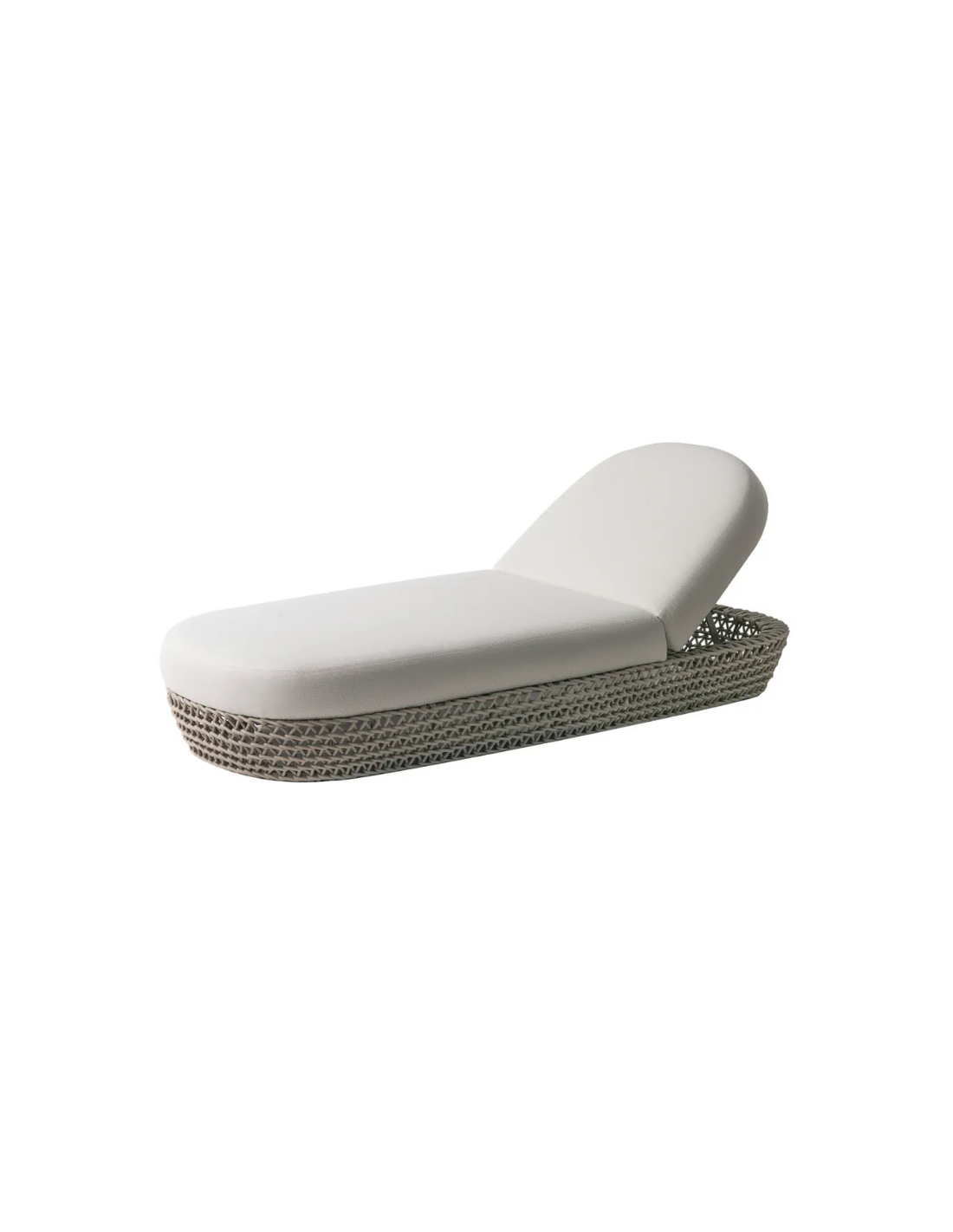 Solseng udført i et design af beige syntetisk rattan med stel af aluminium og med tykke komfortable hynde i taupefarvet vandafvisende olefin (vandafvisende, ikke vandtæt). Solsengen har flere indstillinger for ryggen. Solsengen tåler at stå ude hele sommeren og er resistent overfor regn og fugt.