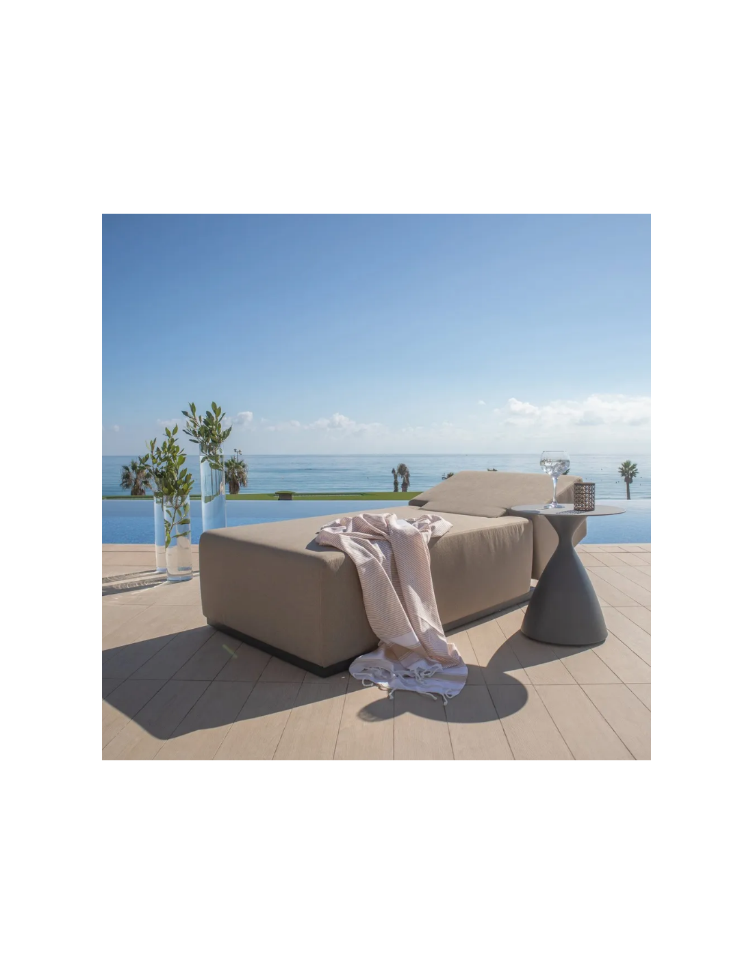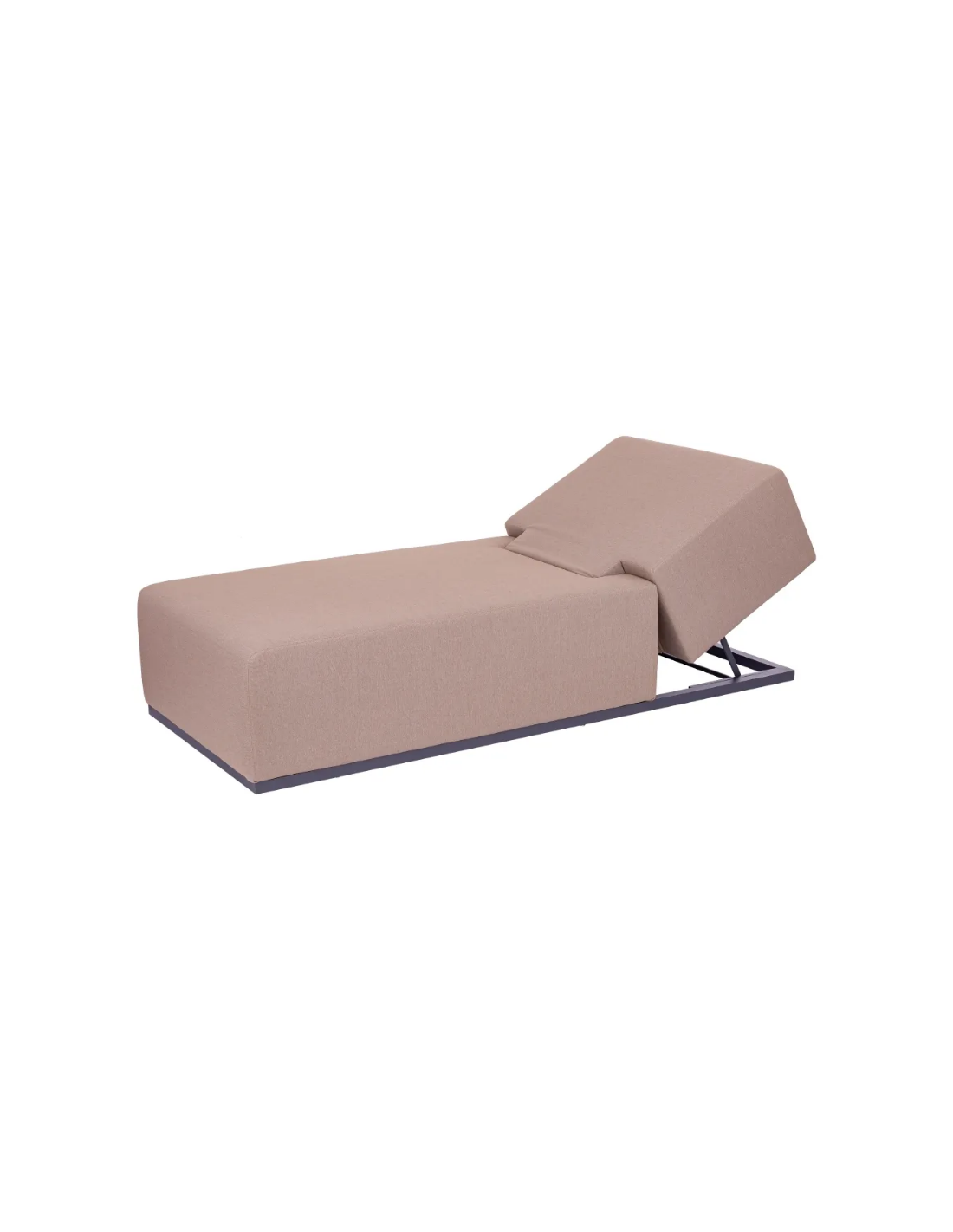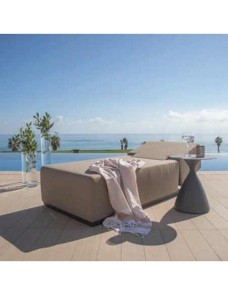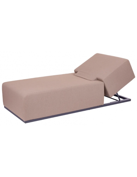 Solseng udført i et design af antracitlakeret aluminium og med tyk komfortabel hynde i moccafarvet vandafvisende olefin (vandafvisende, ikke vandtæt). Solsengen har flere indstillinger for ryggen. Solsengen tåler at stå ude hele sommeren og er resistent overfor regn og fugt.