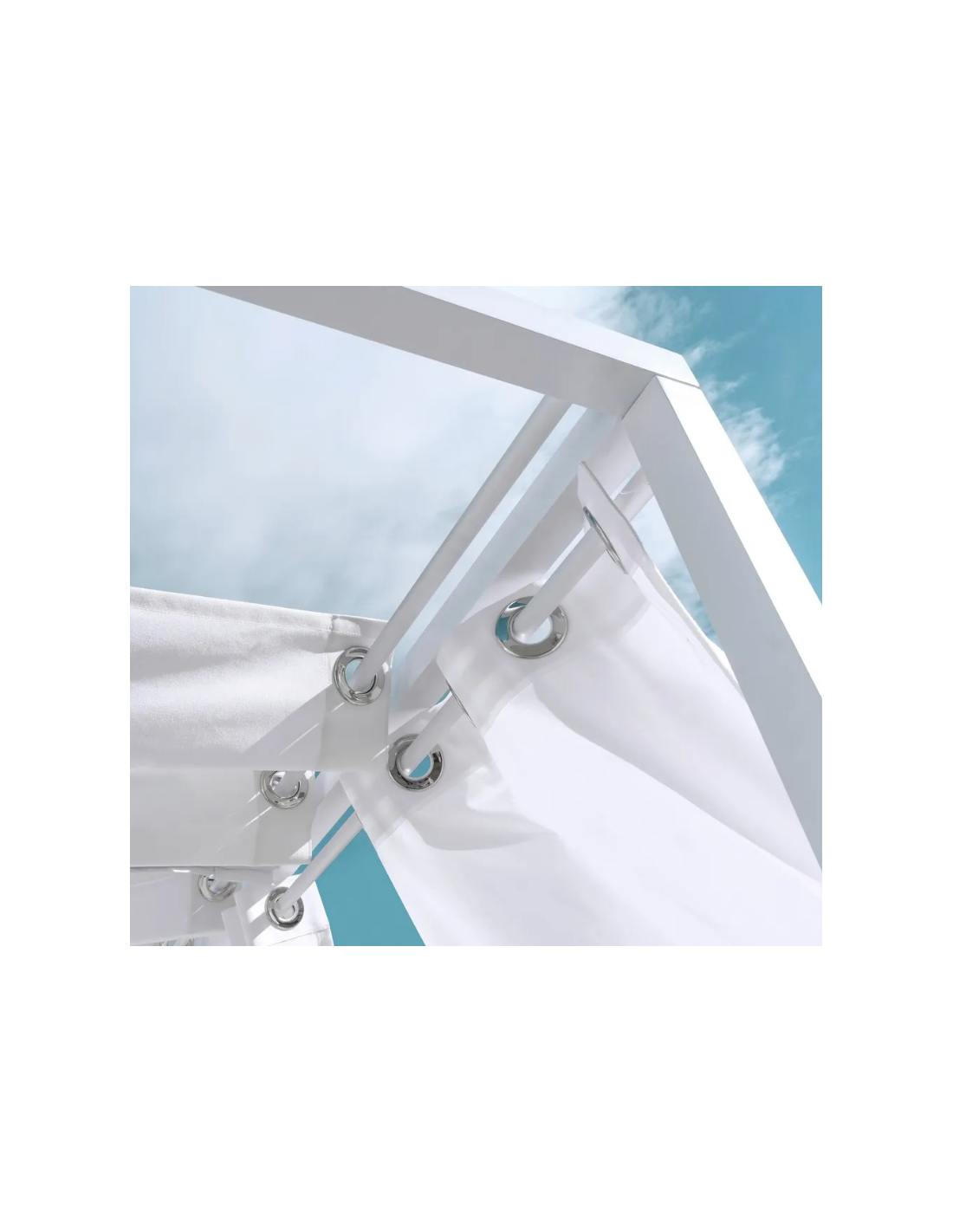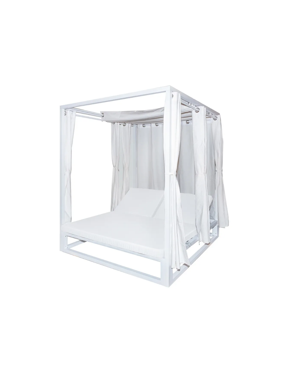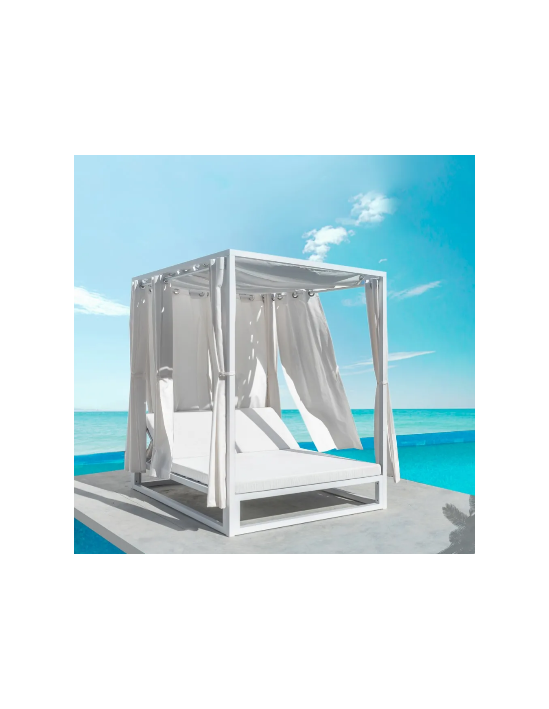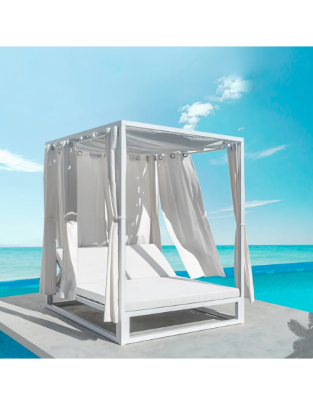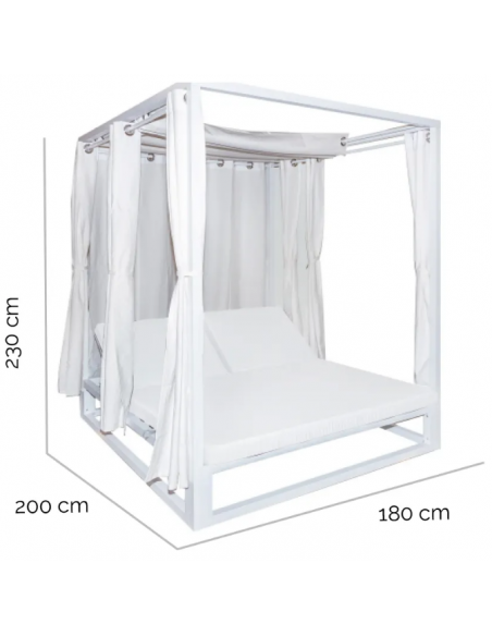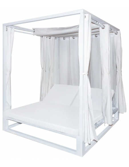 Dobbelt solseng med gardiner og loft, udført i et design af hvidlakeret aluminium og med tykke komfortable hynder i hvidt vandafvisende olefin (vandafvisende, ikke vandtæt). Solsengen har flere indstillinger for ryggen. Solsengen tåler at stå ude hele sommeren og er resistent overfor regn og fugt.