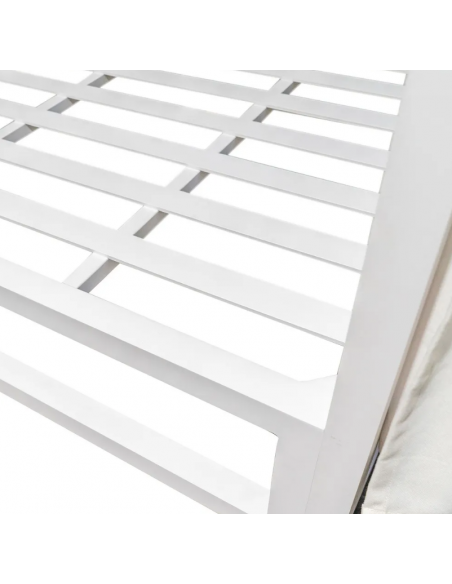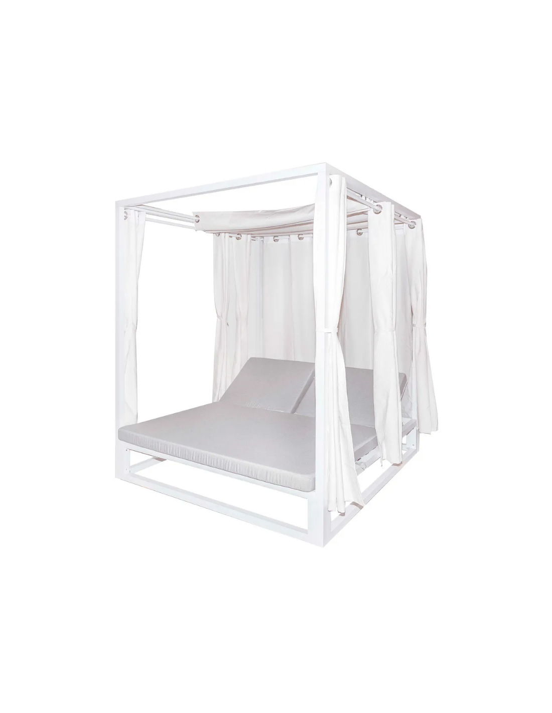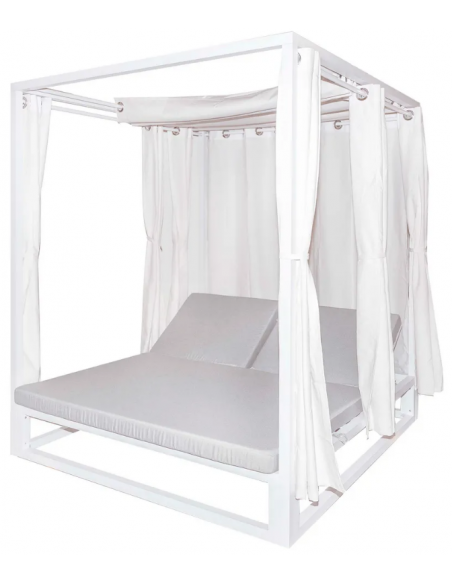 Dobbelt solseng med gardiner og loft, udført i et design af hvidlakeret aluminium og med tykke komfortable hynder i gråt vandafvisende olefin (vandafvisende, ikke vandtæt). Solsengen har flere indstillinger for ryggen. Solsengen tåler at stå ude hele sommeren og er resistent overfor regn og fugt.