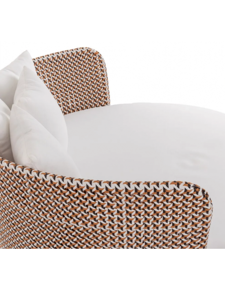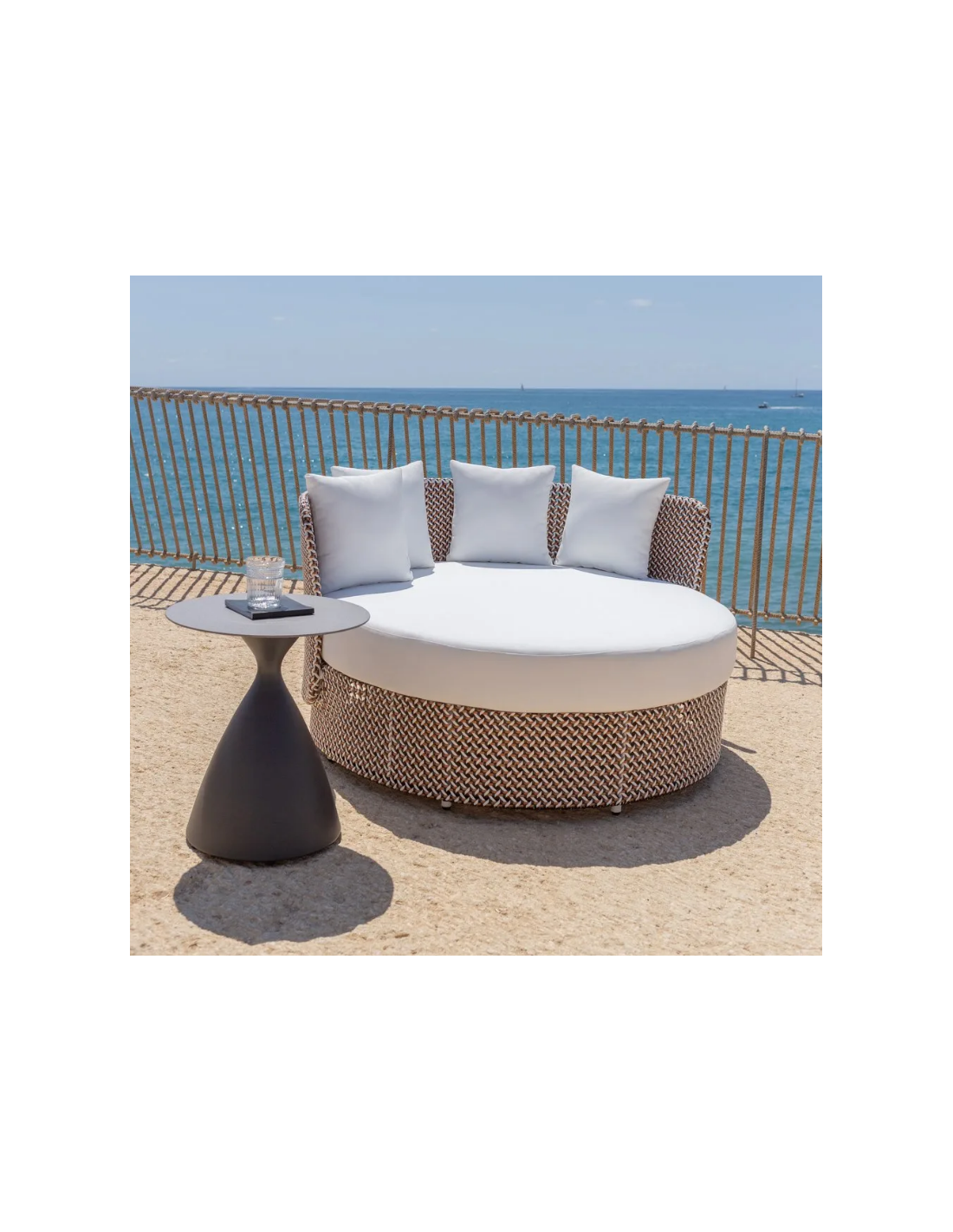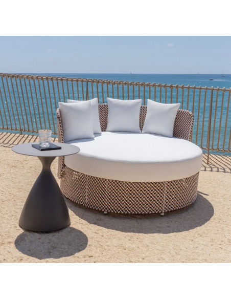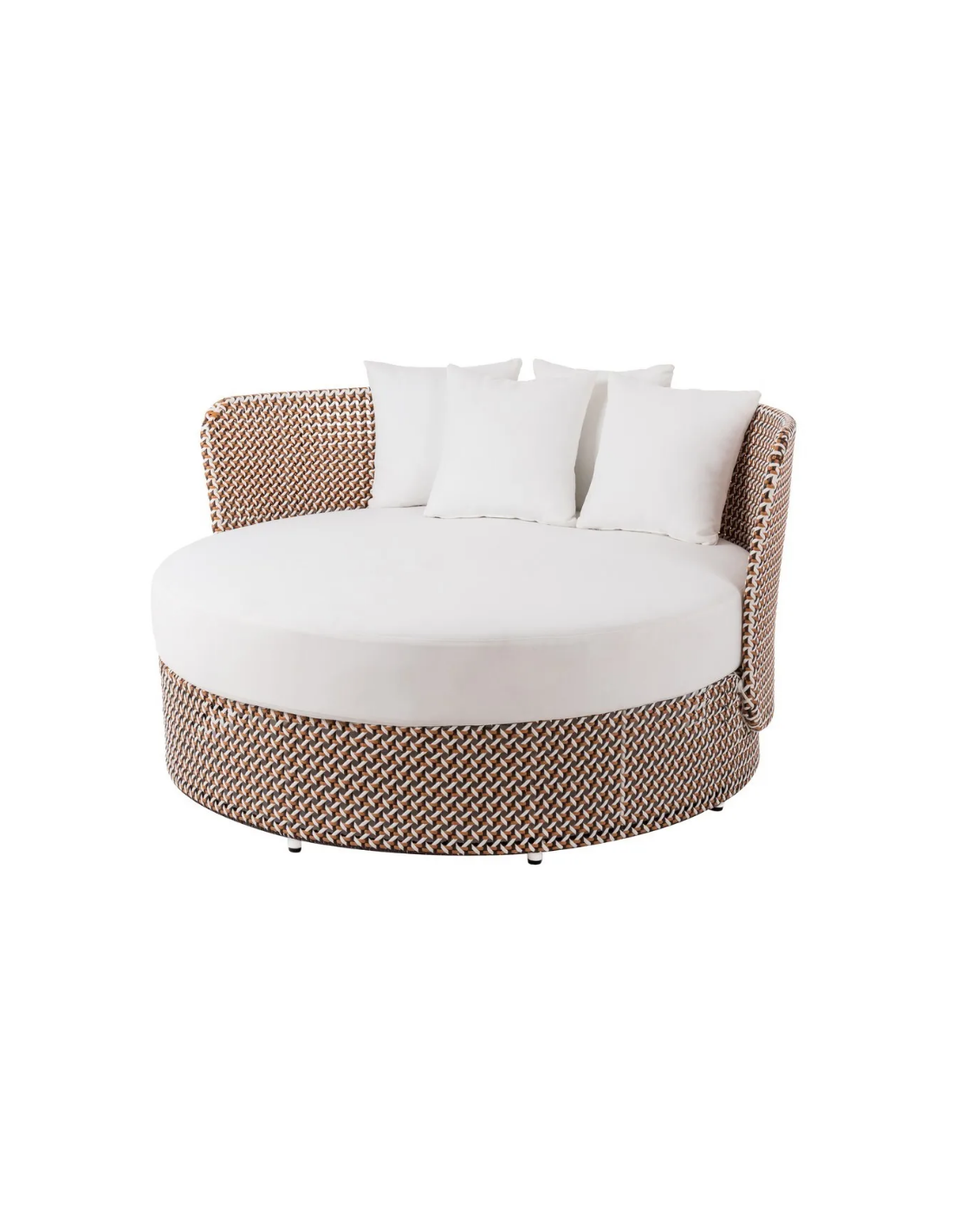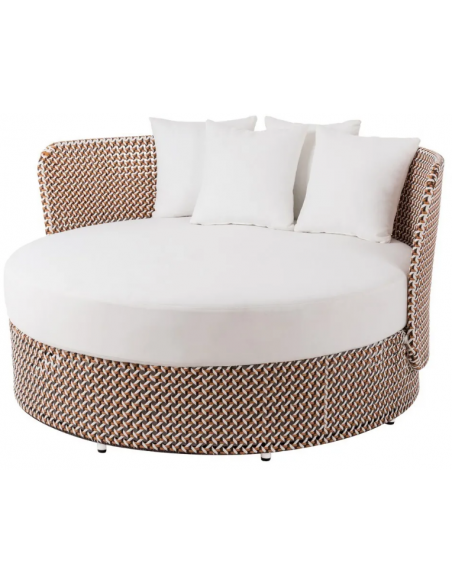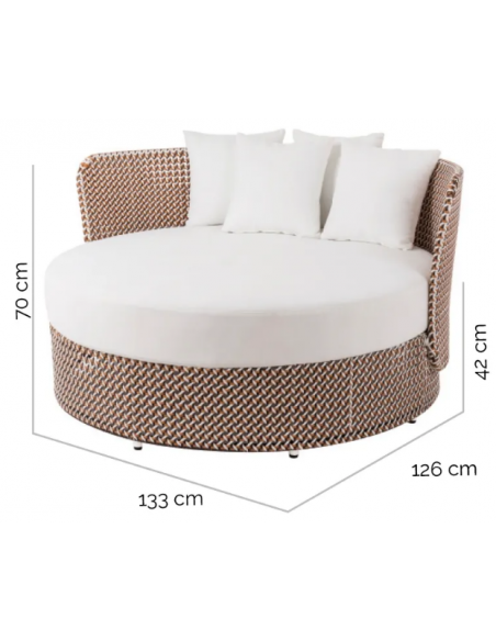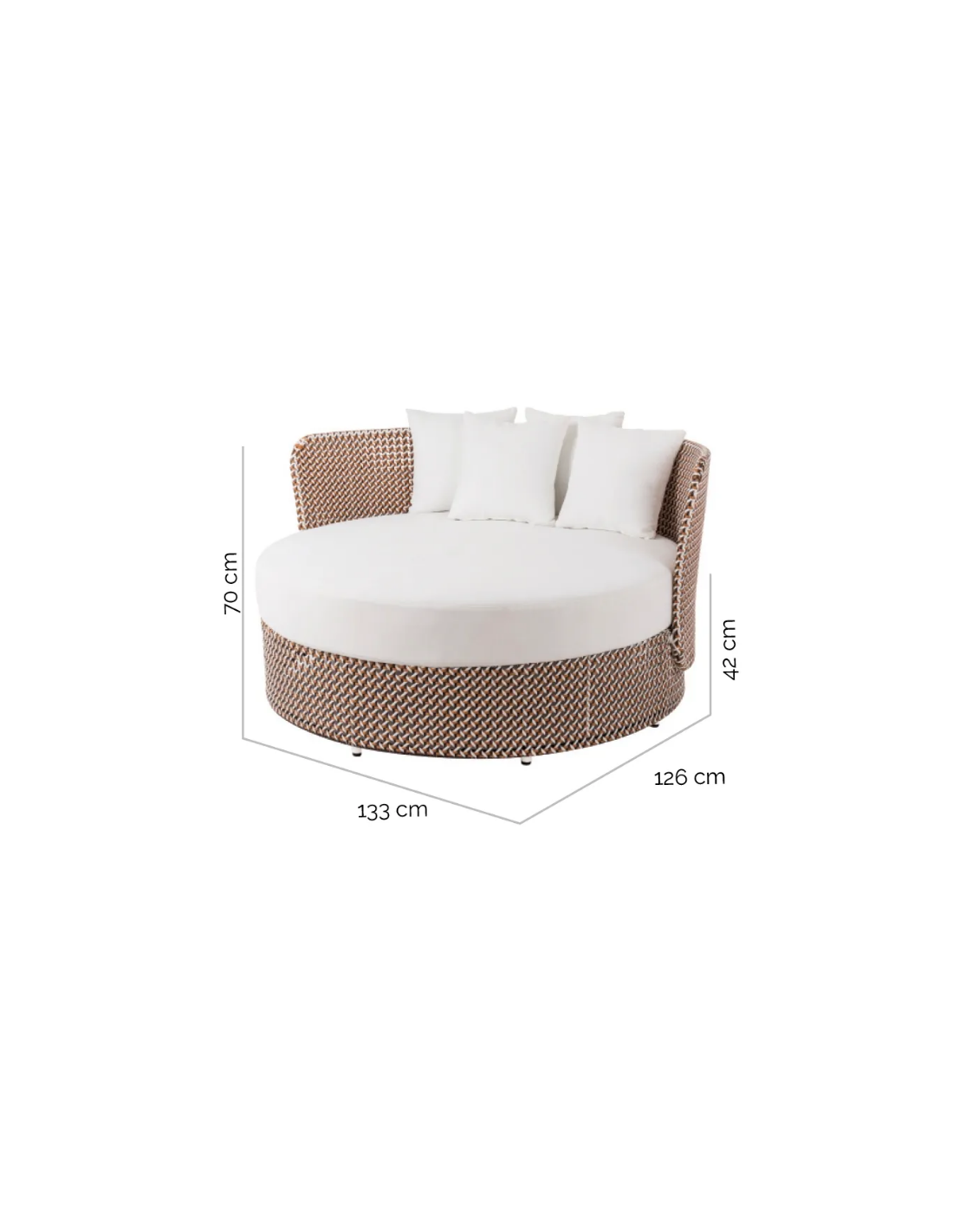 Rund solseng med 4 puder, udført i et design af multifarvet syntetisk rattan med skelet i aluminium og med tyk komfortabel hynde i beige vandafvisende olefin (vandafvisende, ikke vandtæt). Solsengen tåler at stå ude hele sommeren og er resistent overfor regn og fugt.
