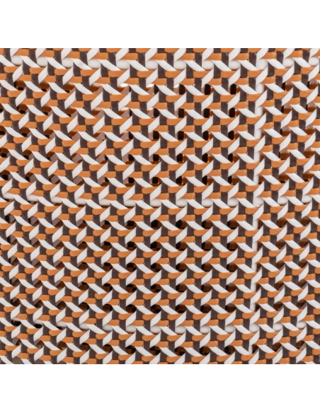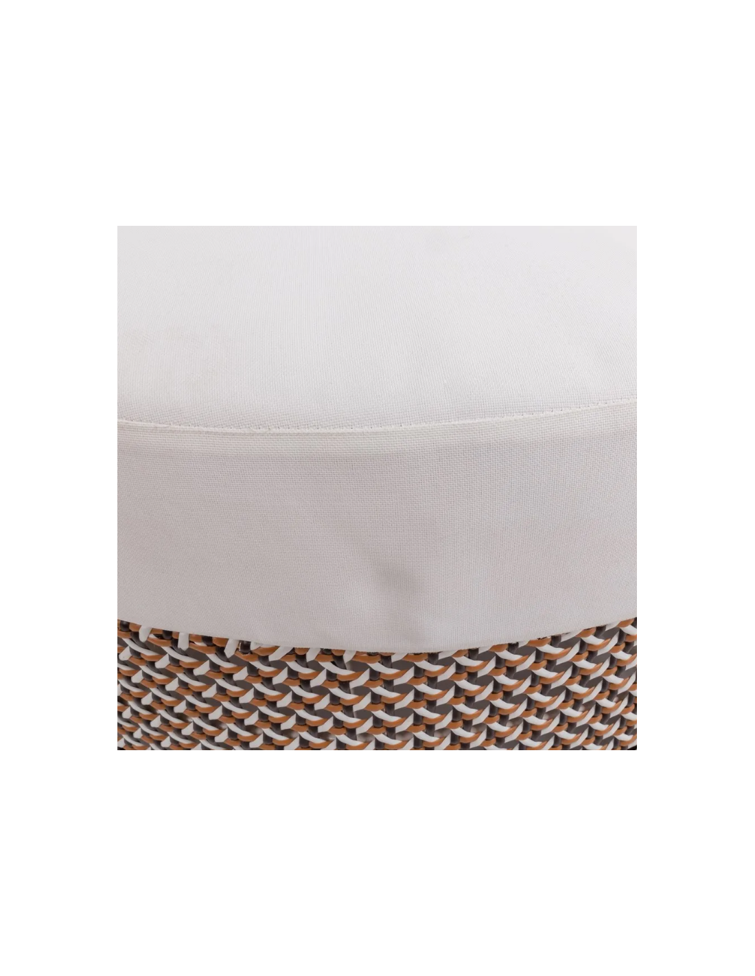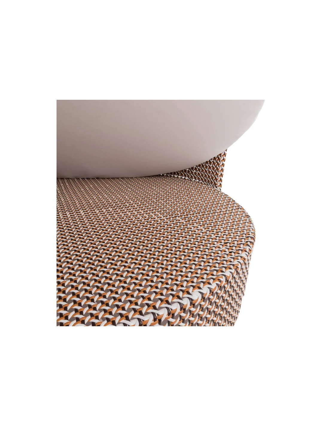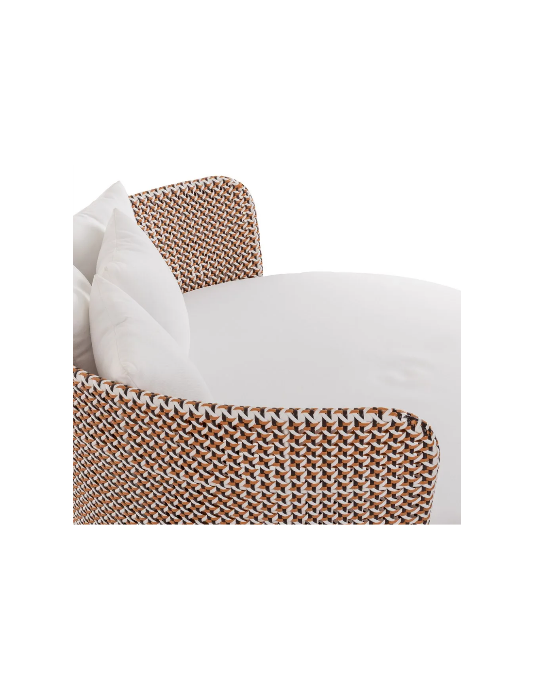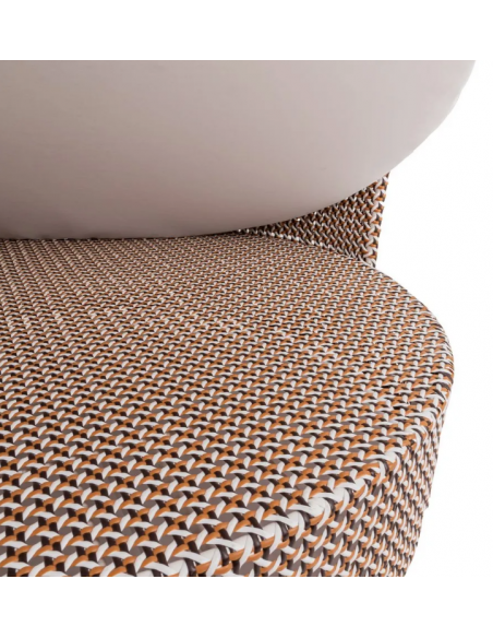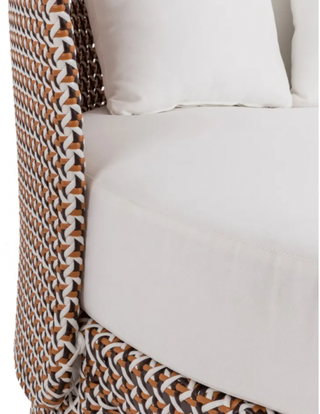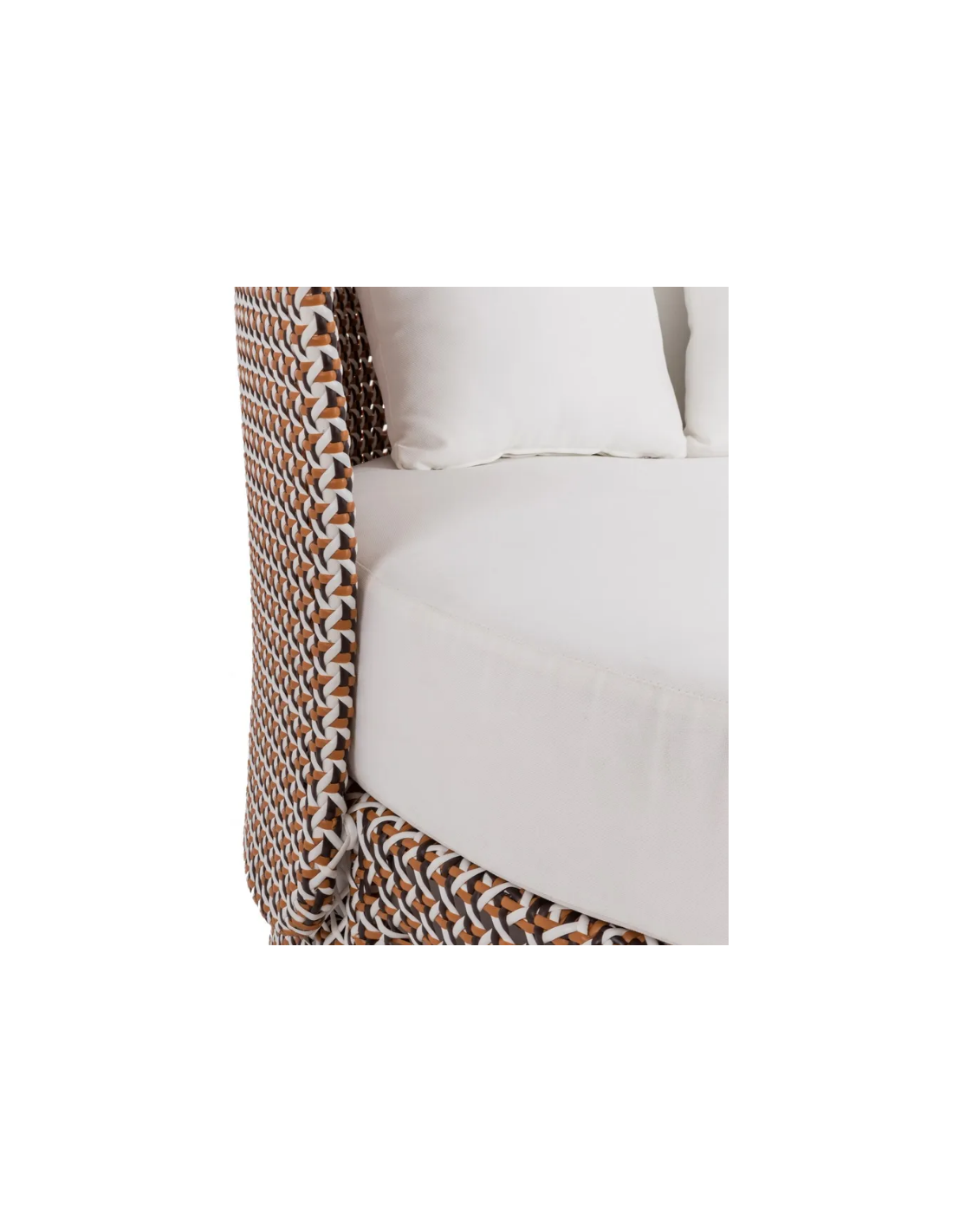 Rund solseng med 4 puder, udført i et design af multifarvet syntetisk rattan med skelet i aluminium og med tyk komfortabel hynde i beige vandafvisende olefin (vandafvisende, ikke vandtæt). Solsengen tåler at stå ude hele sommeren og er resistent overfor regn og fugt.