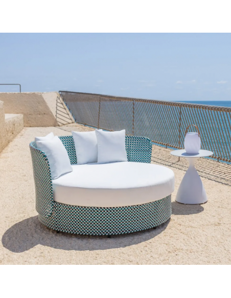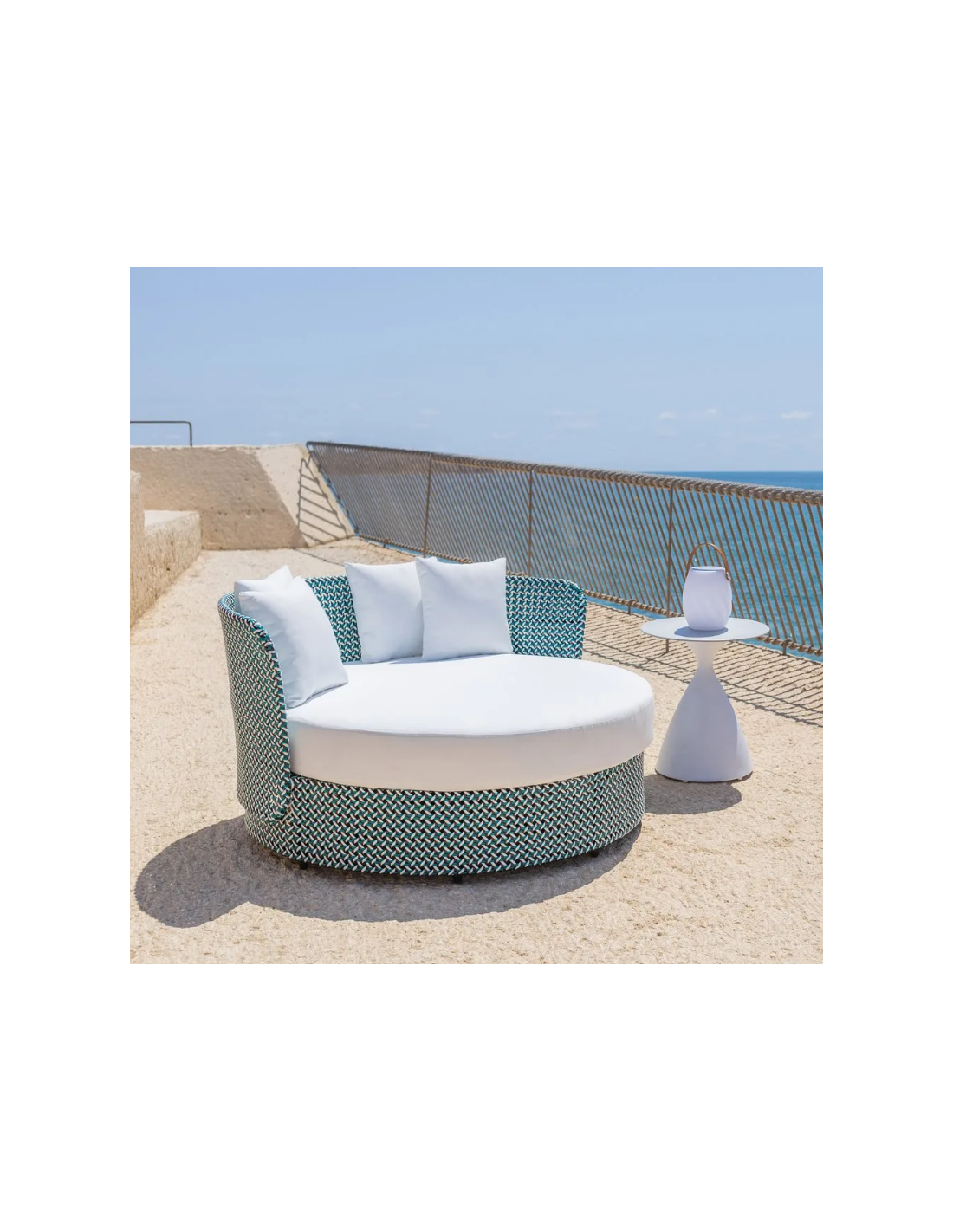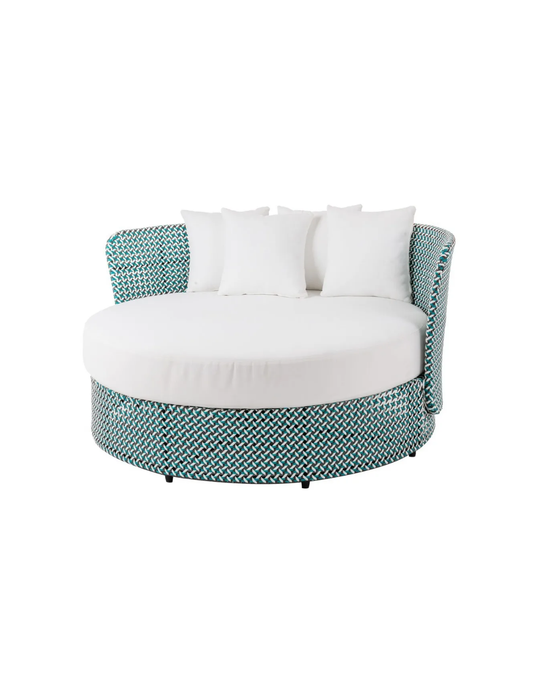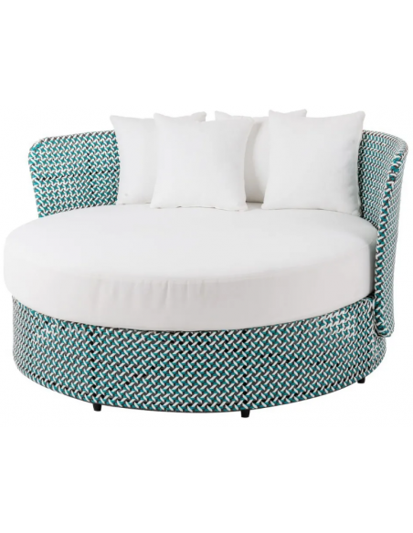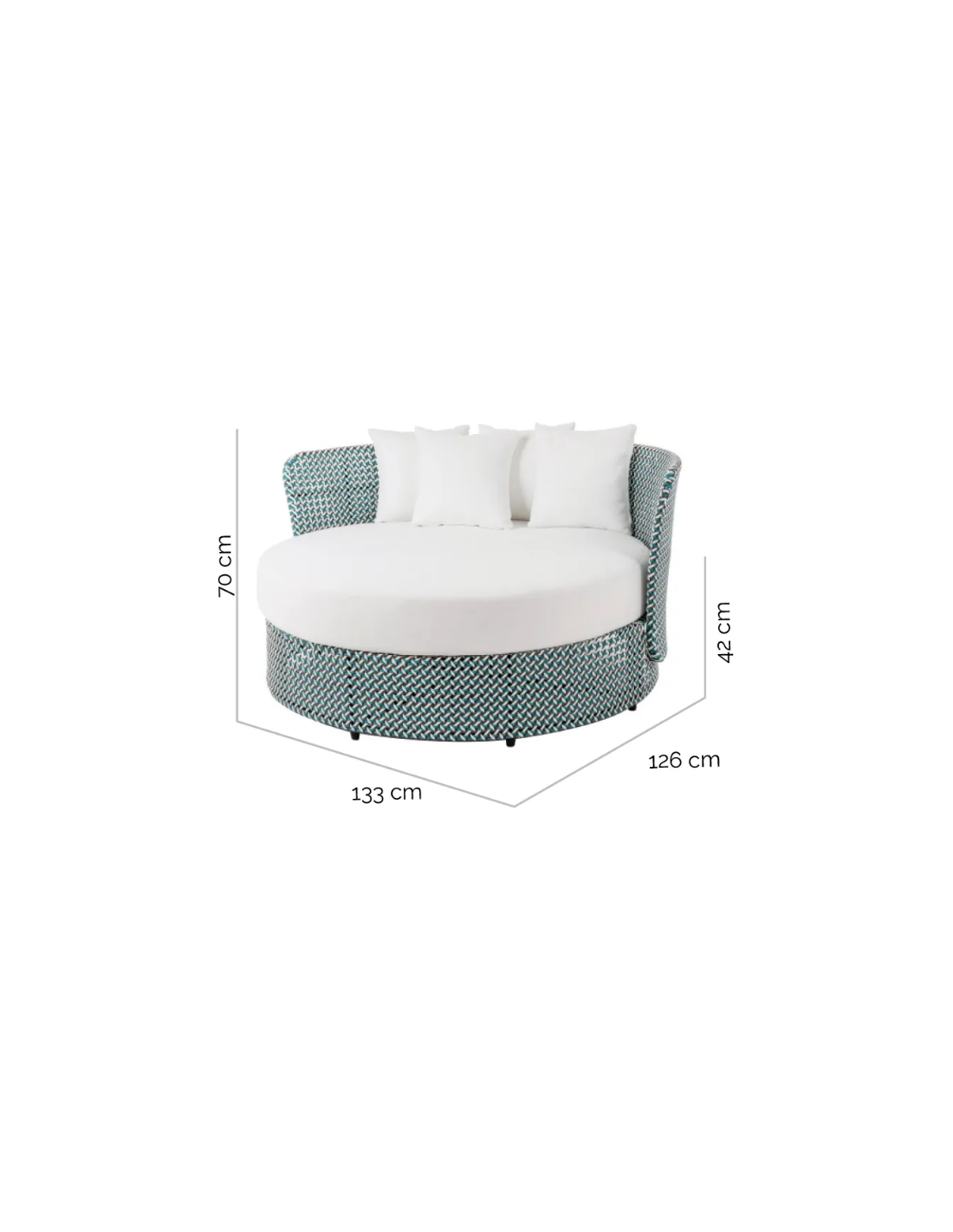 Rund solseng med 4 puder, udført i et design af multifarvet syntetisk rattan med skelet i aluminium og med tyk komfortabel hynde i beige vandafvisende olefin (vandafvisende, ikke vandtæt). Solsengen tåler at stå ude hele sommeren og er resistent overfor regn og fugt.