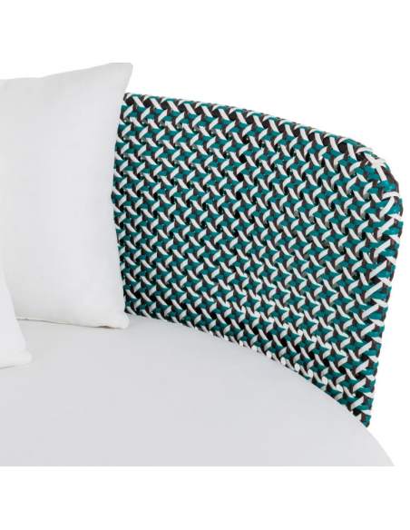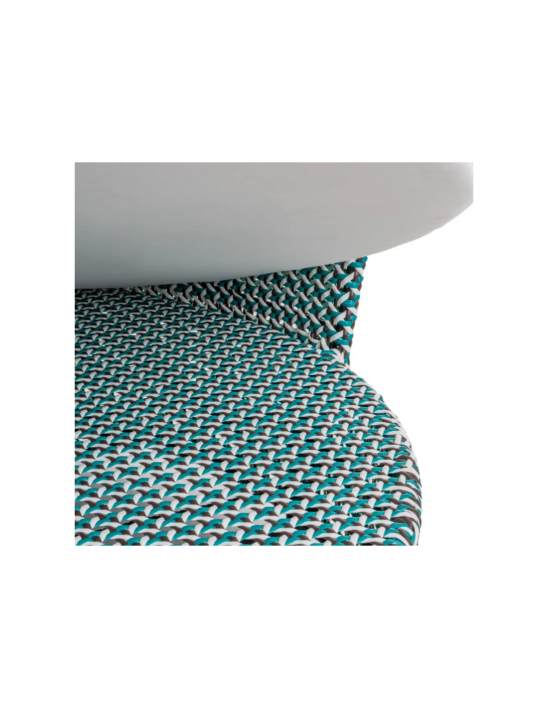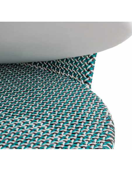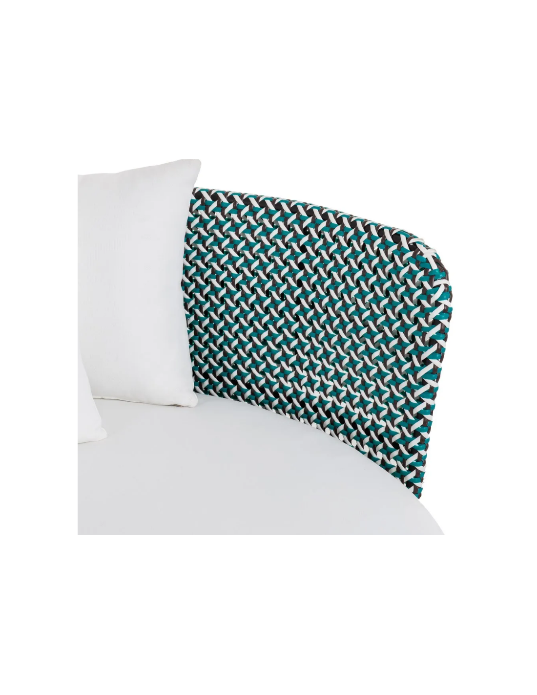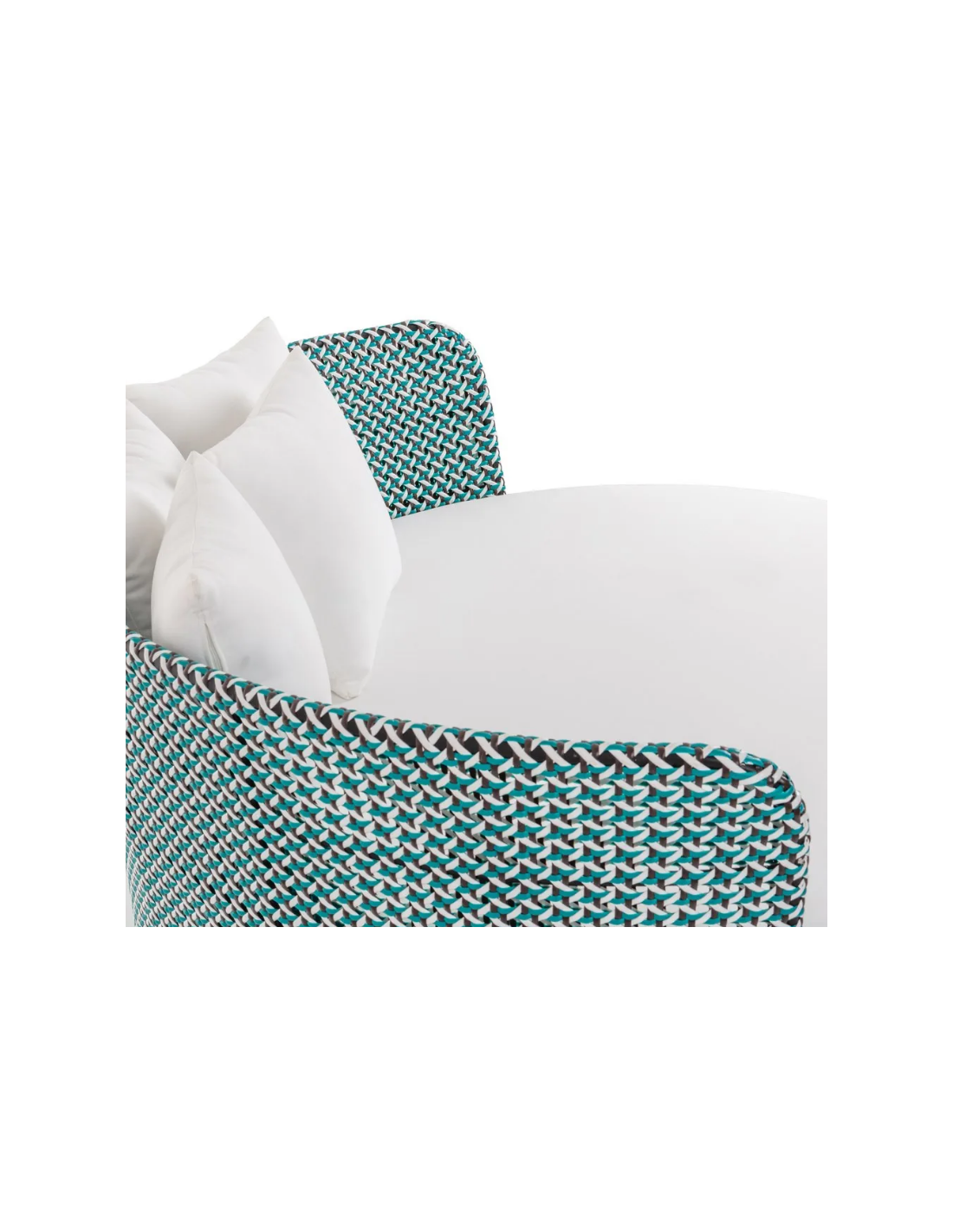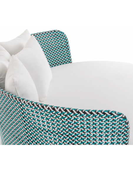 Rund solseng med 4 puder, udført i et design af multifarvet syntetisk rattan med skelet i aluminium og med tyk komfortabel hynde i beige vandafvisende olefin (vandafvisende, ikke vandtæt). Solsengen tåler at stå ude hele sommeren og er resistent overfor regn og fugt.