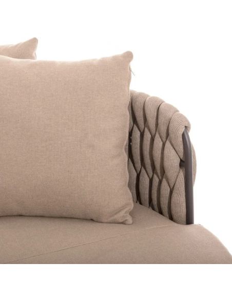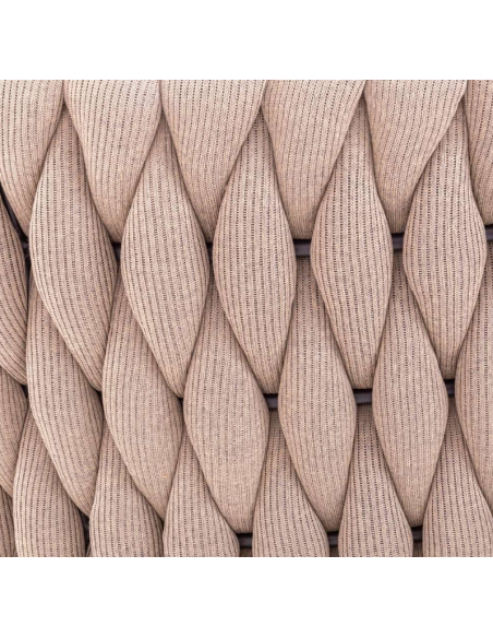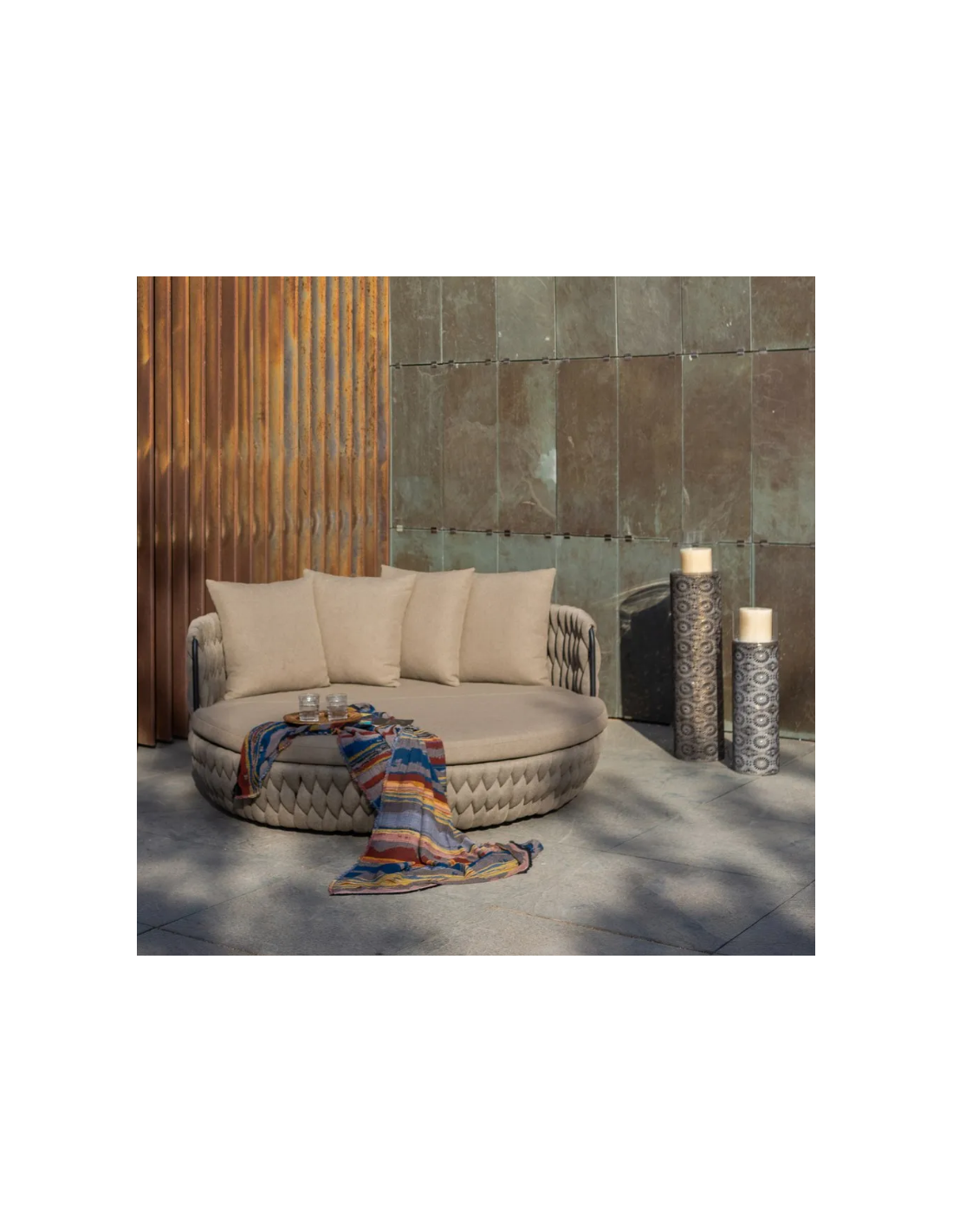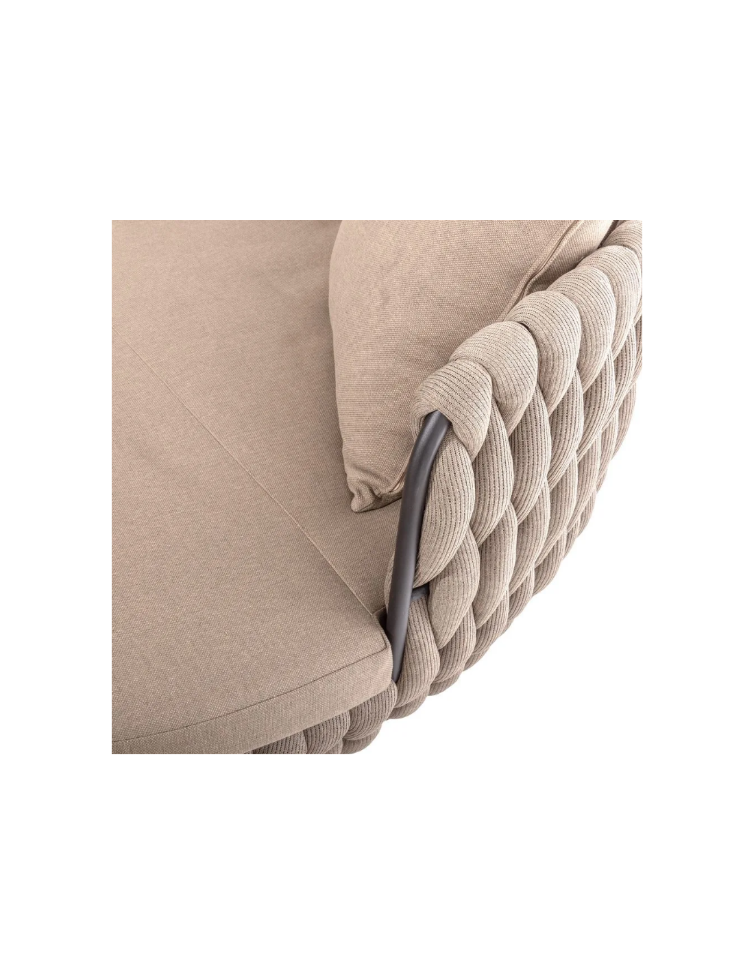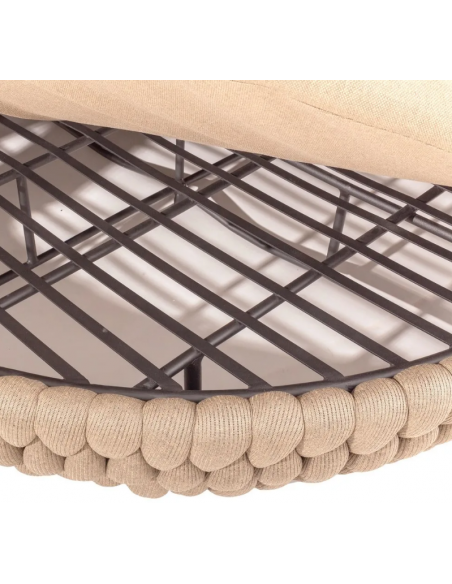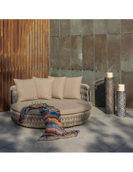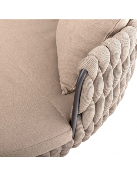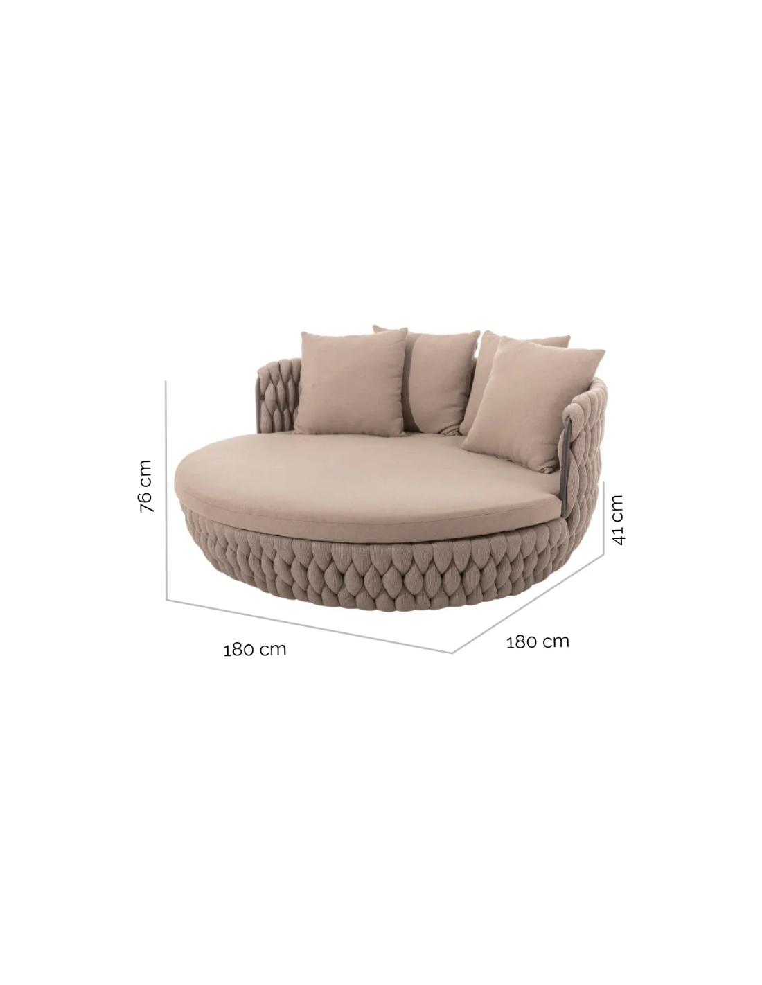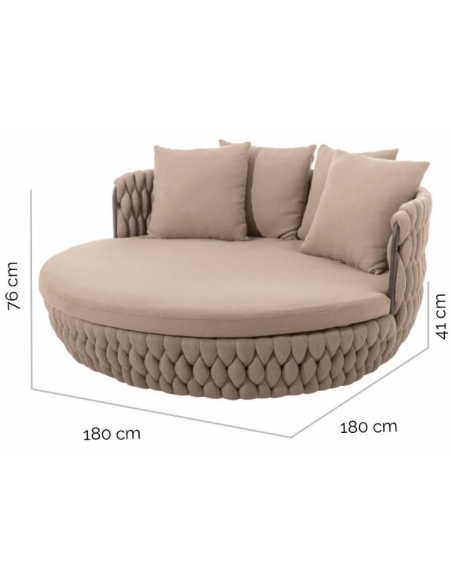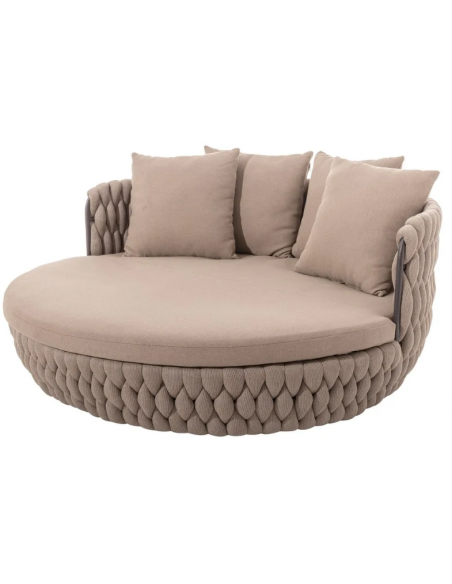 Rund solseng med 4 puder, udført i et design af taupefarvet olefin med skelet i aluminium og med tyk komfortabel hynde i vandafvisende olefin (vandafvisende, ikke vandtæt). Solsengen tåler at stå ude hele sommeren og er resistent overfor regn og fugt.