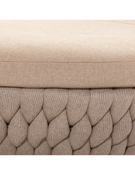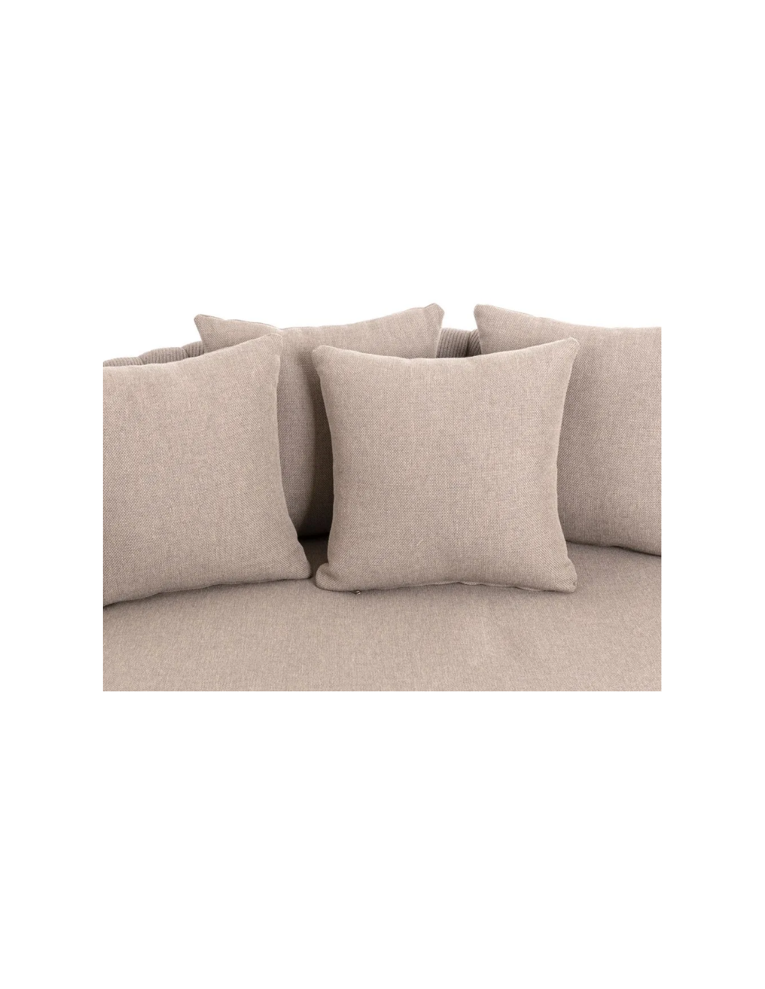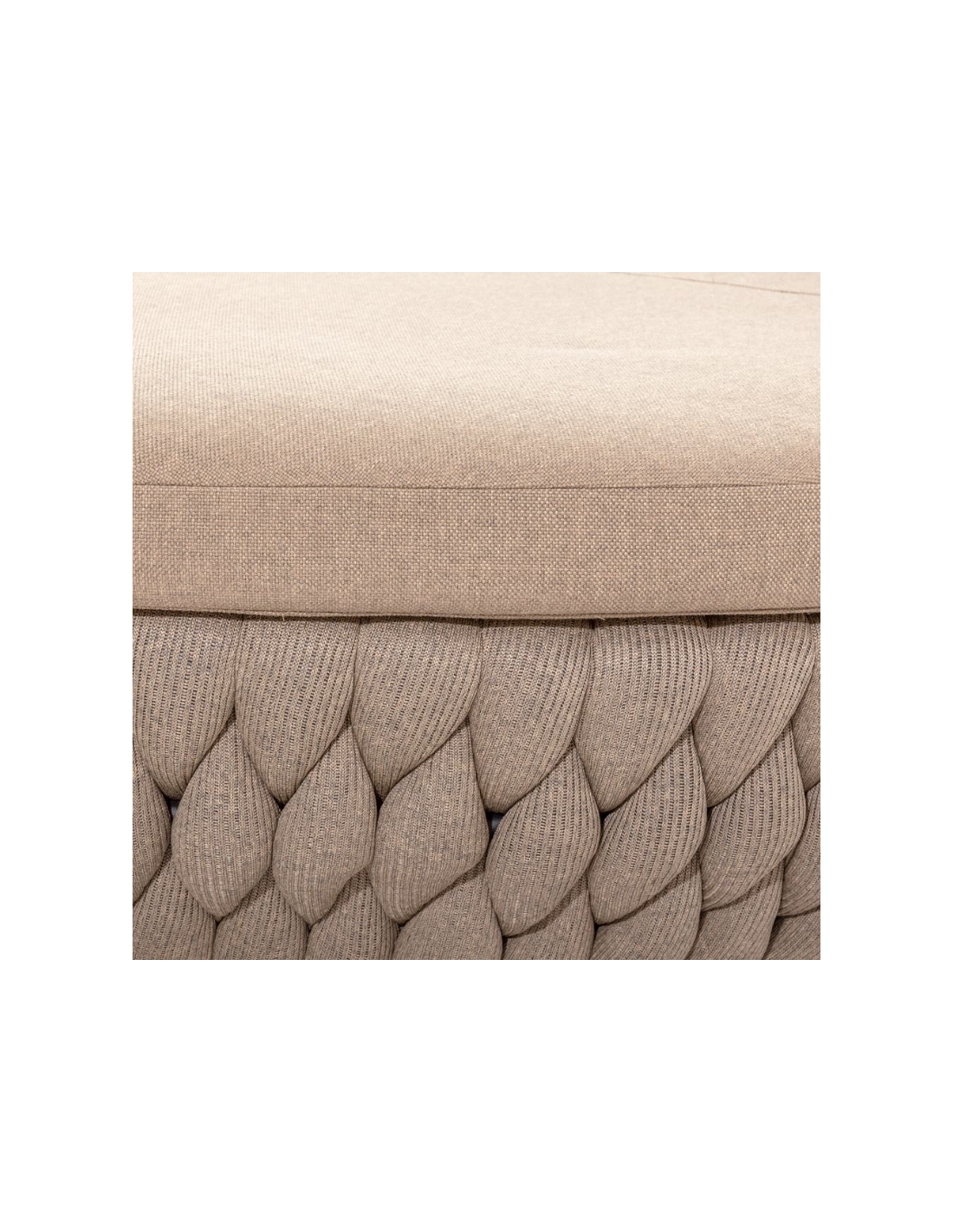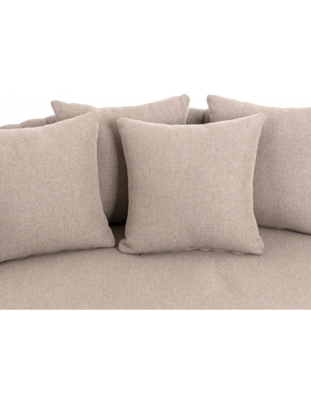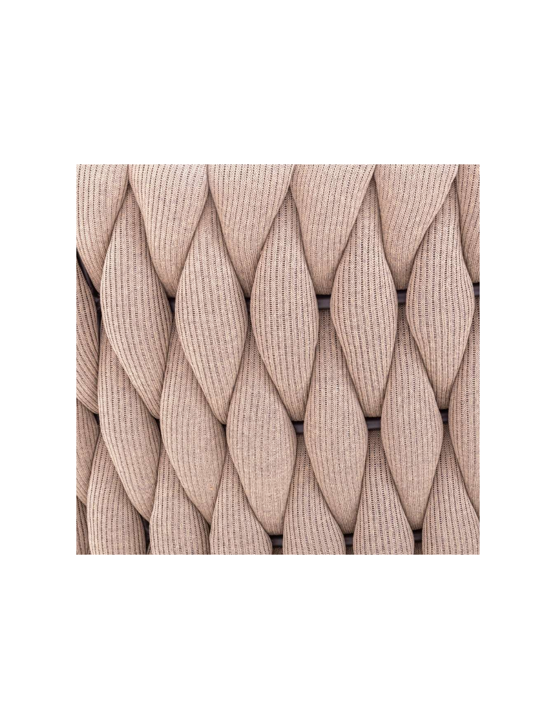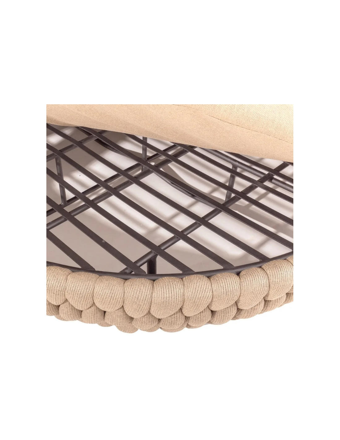 Rund solseng med 4 puder, udført i et design af taupefarvet olefin med skelet i aluminium og med tyk komfortabel hynde i vandafvisende olefin (vandafvisende, ikke vandtæt). Solsengen tåler at stå ude hele sommeren og er resistent overfor regn og fugt.