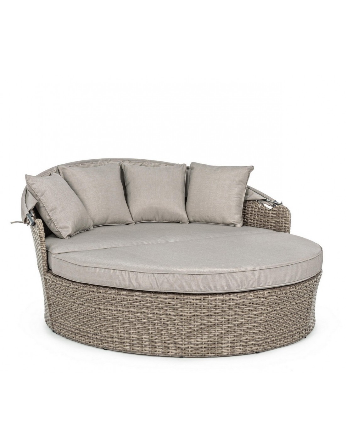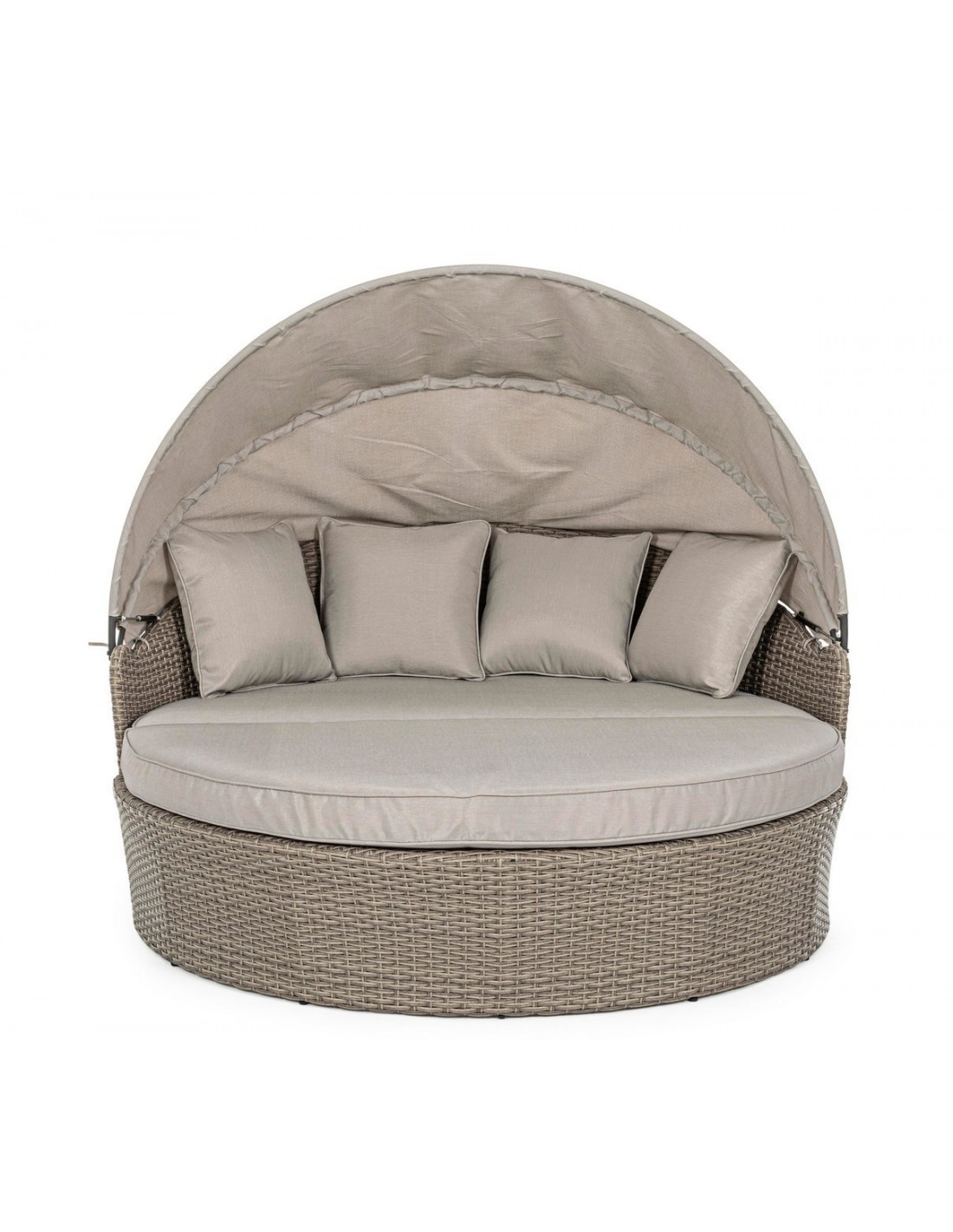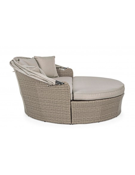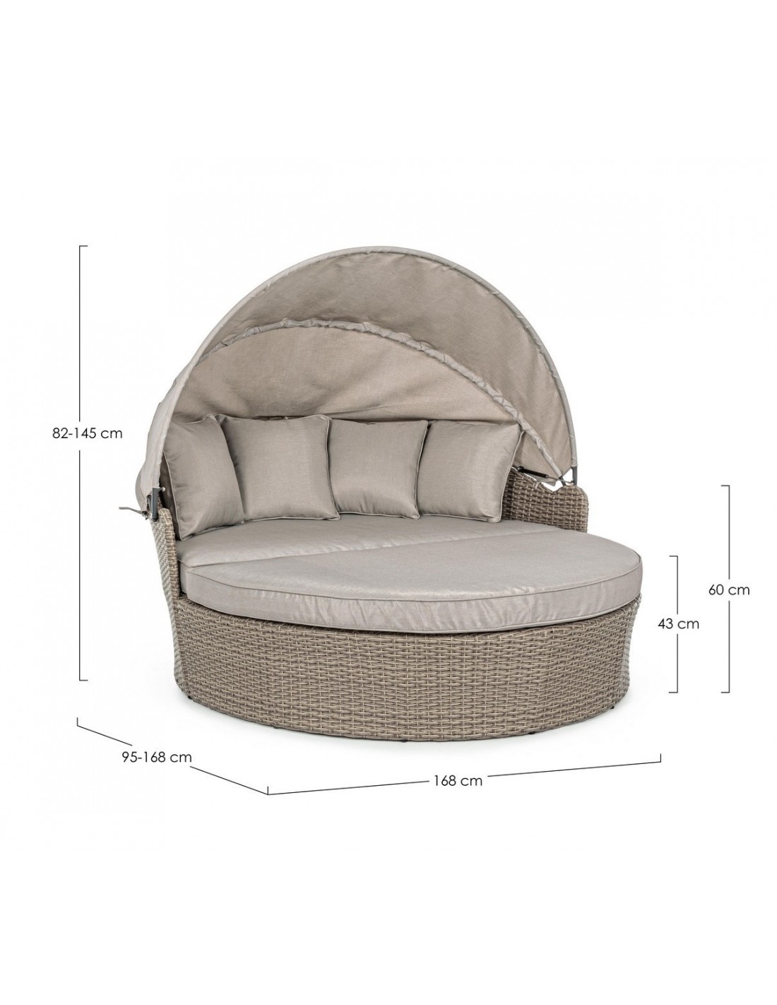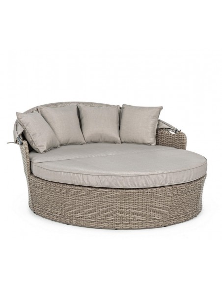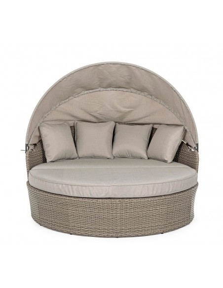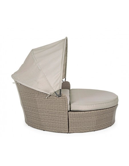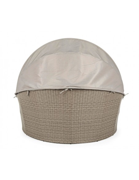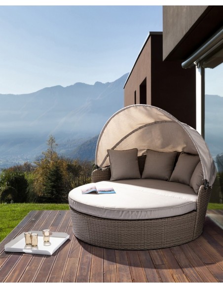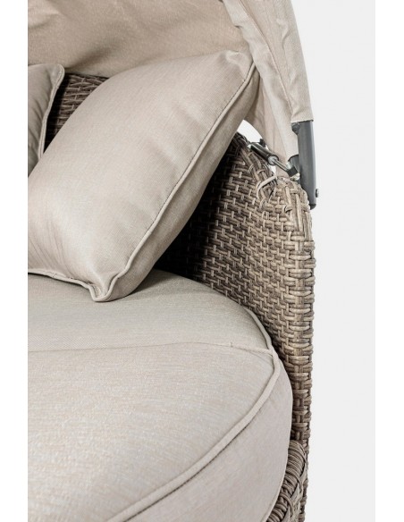 Daybed solseng udført i et design af syntetisk rattan med skelet i rustfri aluminium. Hynder og tag er fremstillet i olefin, der er vandafvisende (ikke vandtæt). Solsengen måler 82 - 145 cm i højden og 168 cm i diameter. Taget skydes via gaspatron.