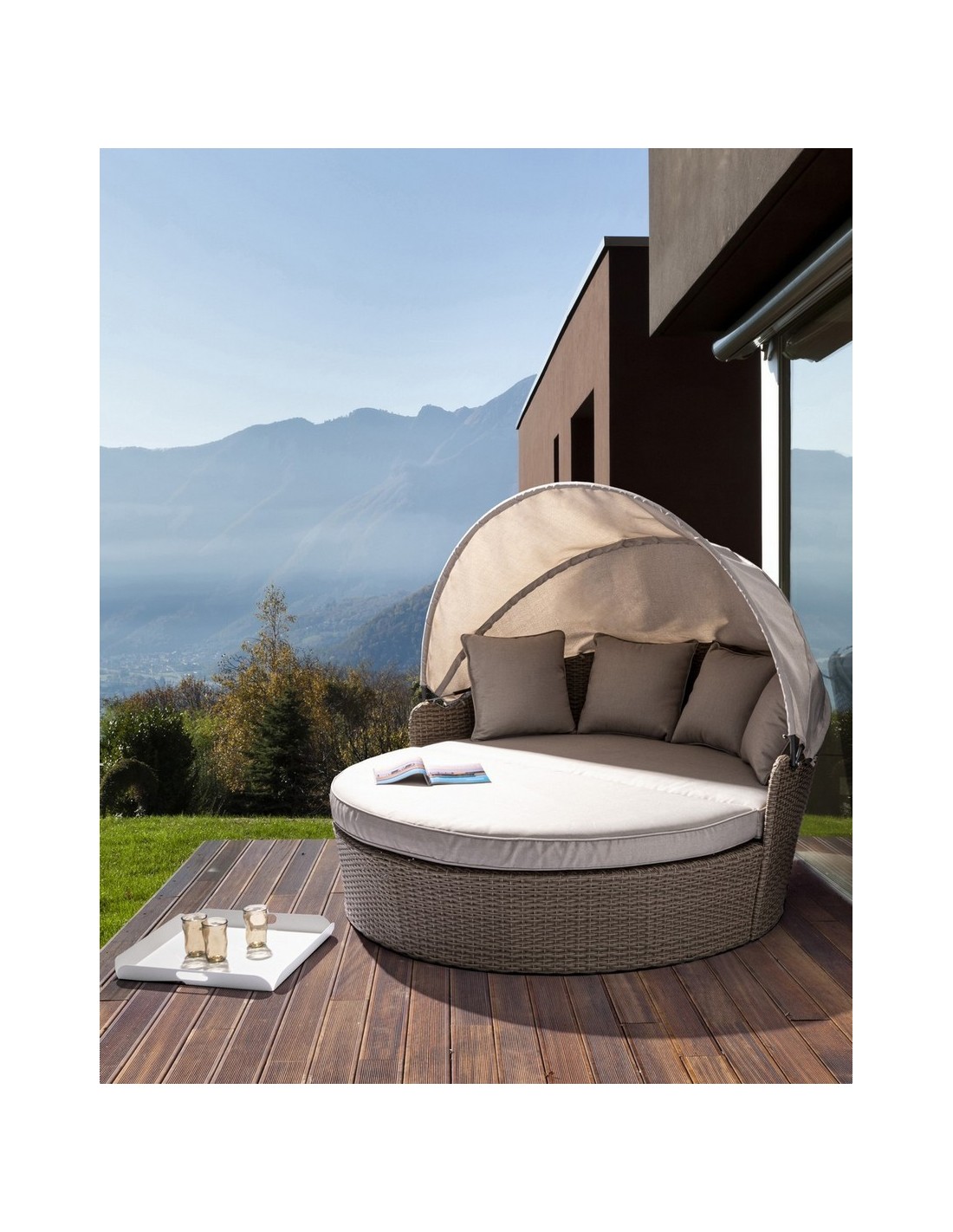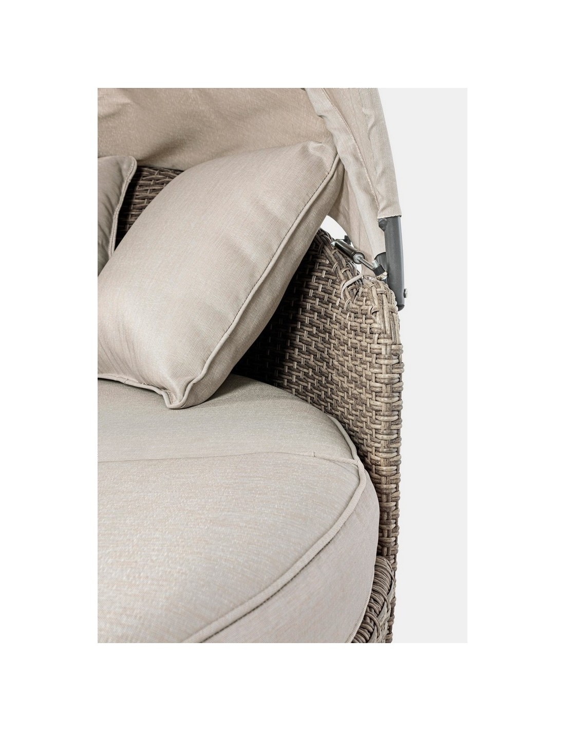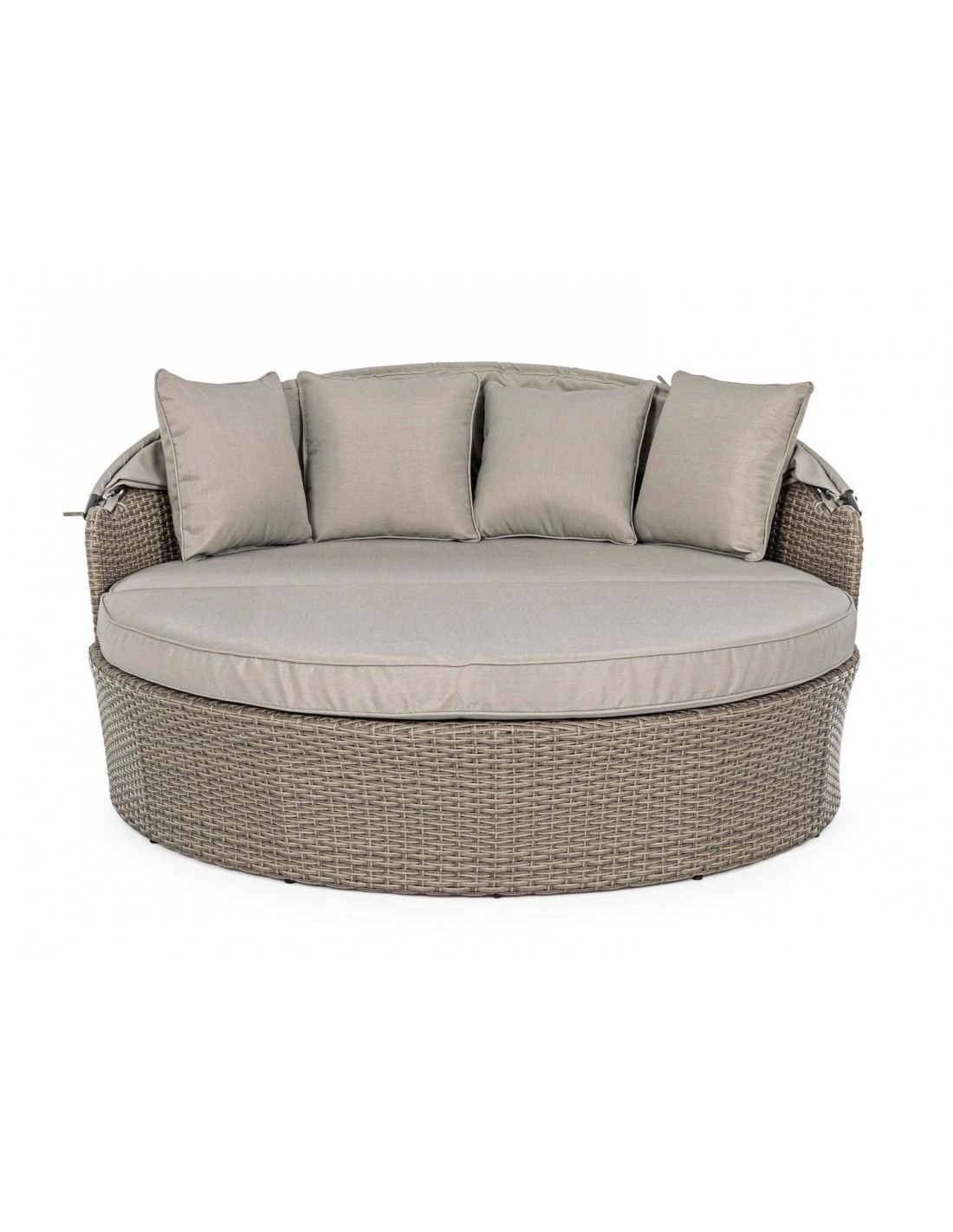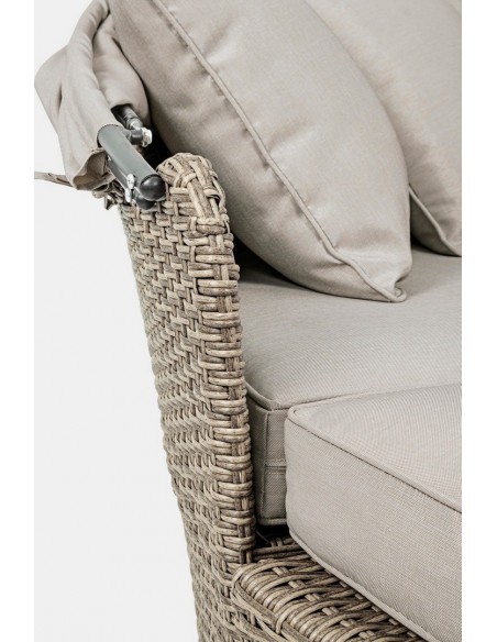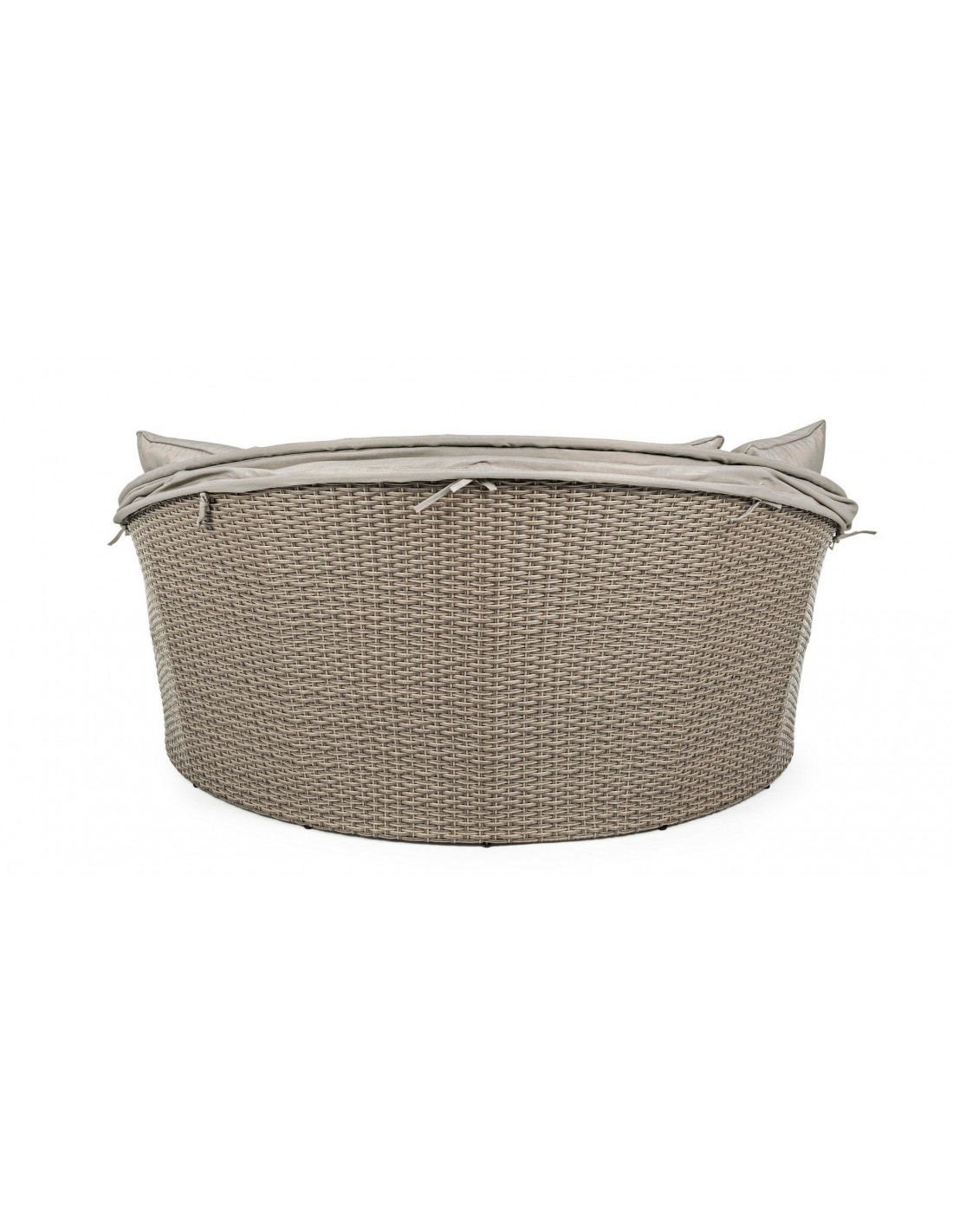 Daybed solseng udført i et design af syntetisk rattan med skelet i rustfri aluminium. Hynder og tag er fremstillet i olefin, der er vandafvisende (ikke vandtæt). Solsengen måler 82 - 145 cm i højden og 168 cm i diameter. Taget skydes via gaspatron.