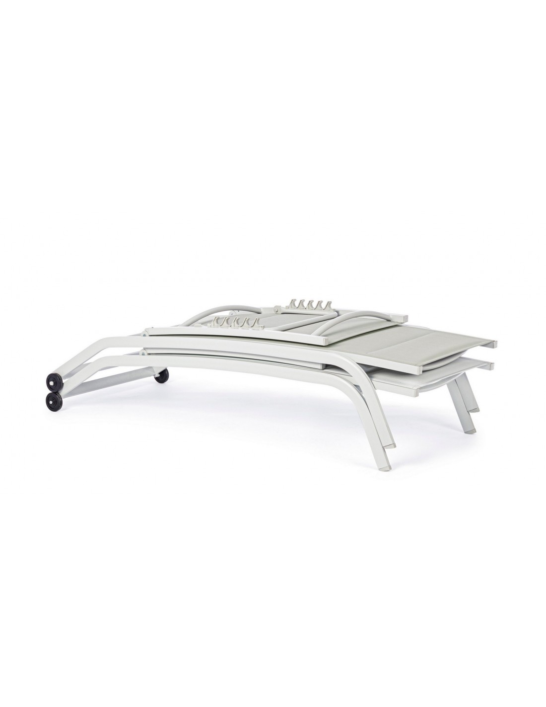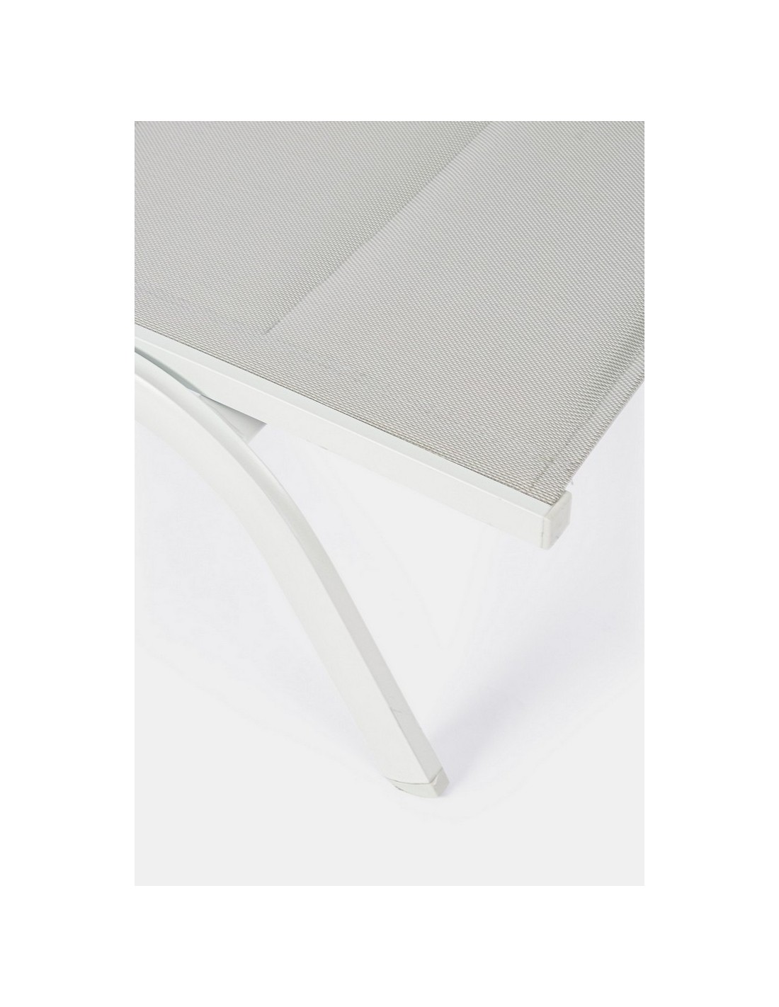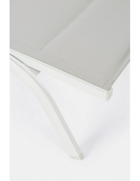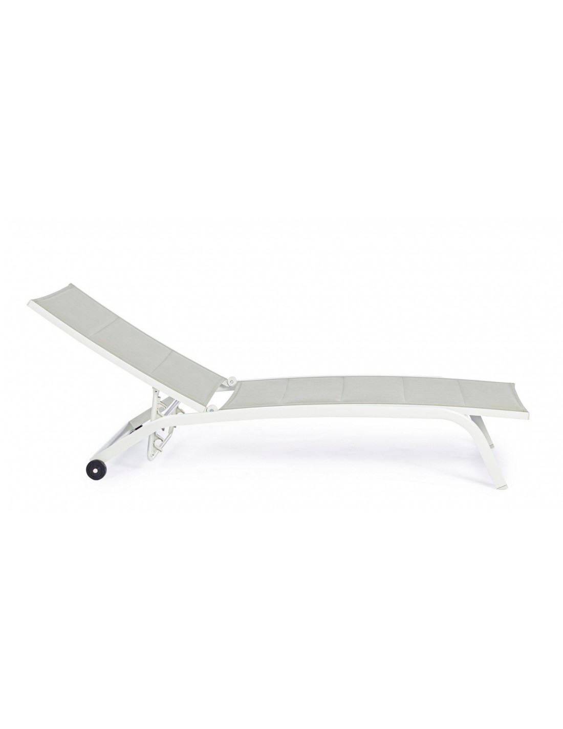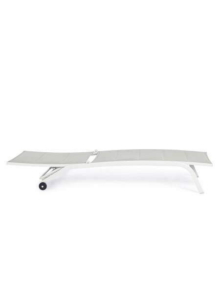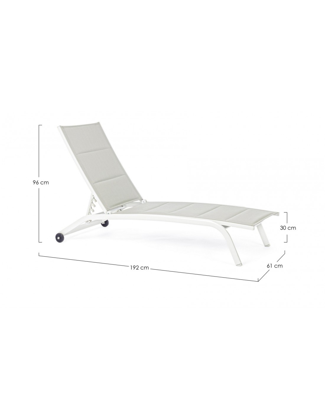 Solseng udført i et design af hvid pulverlakeret aluminium og lysegrå textilene. Solsengen måler 30 - 96 cm i højden og 192 x 61 cm i bredde og dybde. Solsengen tåler at stå ude i regnvejr.