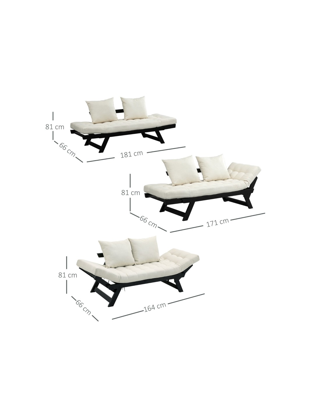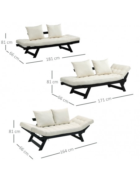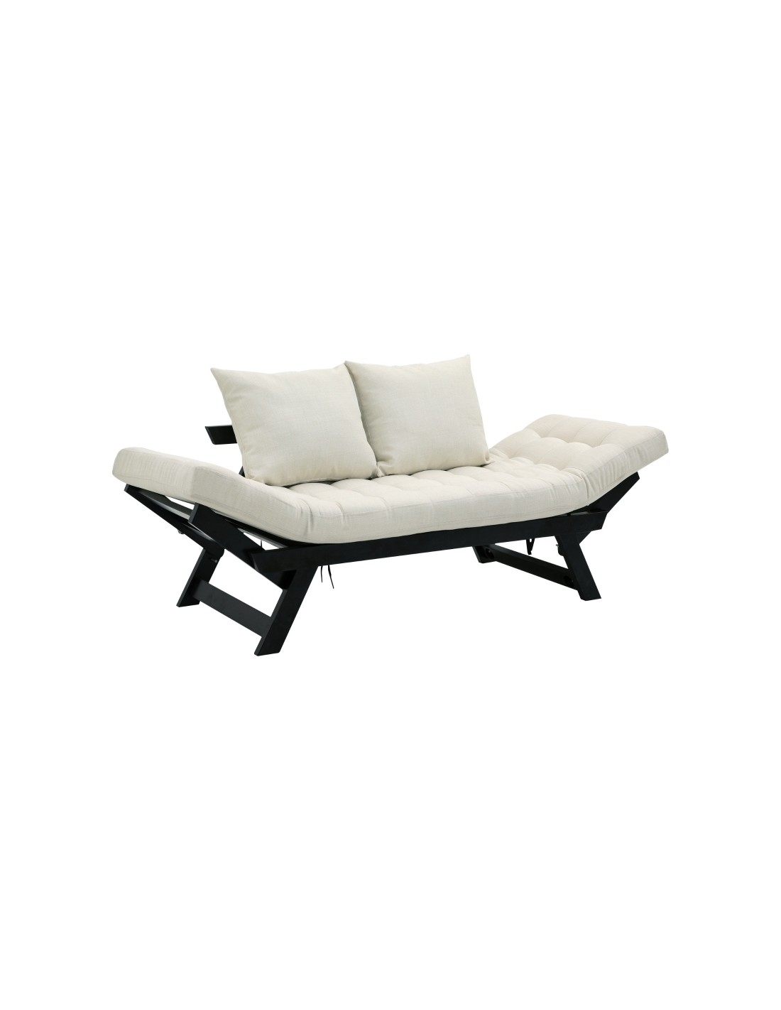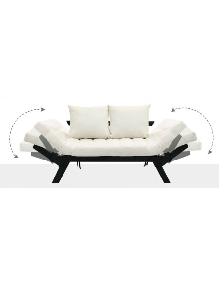 Sovesofa daybed med 3 opsætningsmuligheder, udført i et design af sortlakeret egetræ og cremefarvet polyester. Sofaen kan lægges ned i armlænene, enten samtidigt eller hver for sig. Sofaen måler op til 181 cm i bredden, afhængig af opstilling og har en sidde/liggehøjde på 41 cm. Hyndetykkelsen er 13 cm.