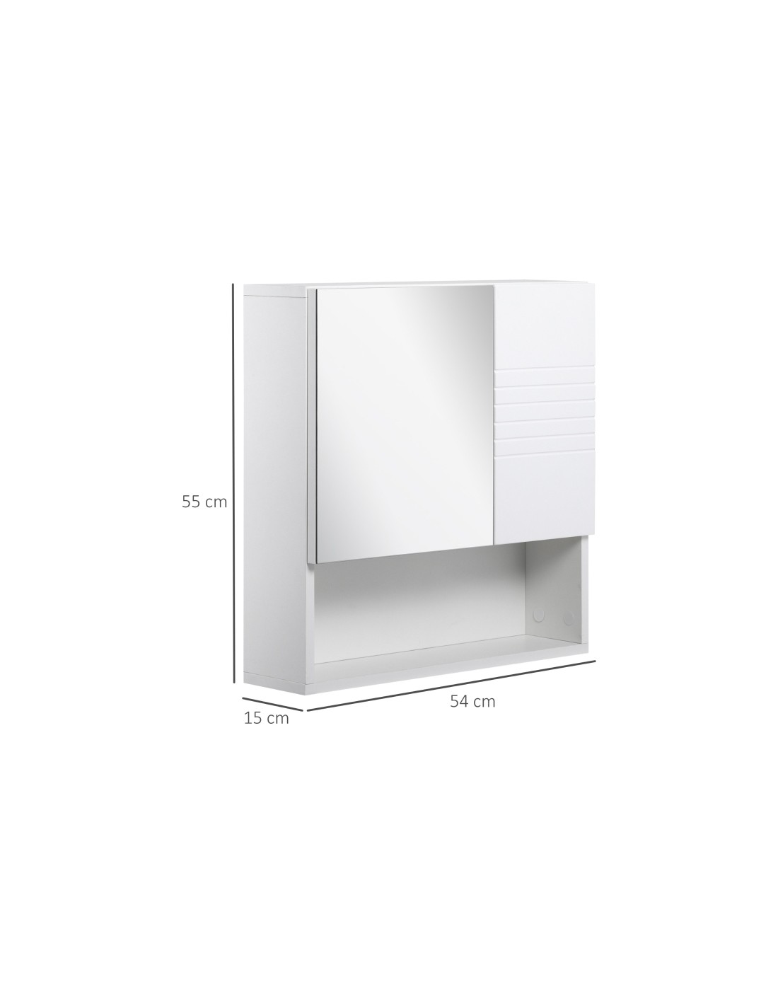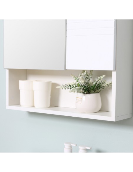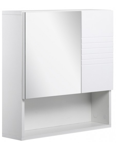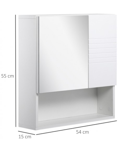 Spejlskab til badeværelset med 1 åbent hylderum og 2 skjulte hylderum med justerbare hylder. Spejlskabet er udført i møbelplade og glas og måler 55 x 54 cm i højde og bredde.