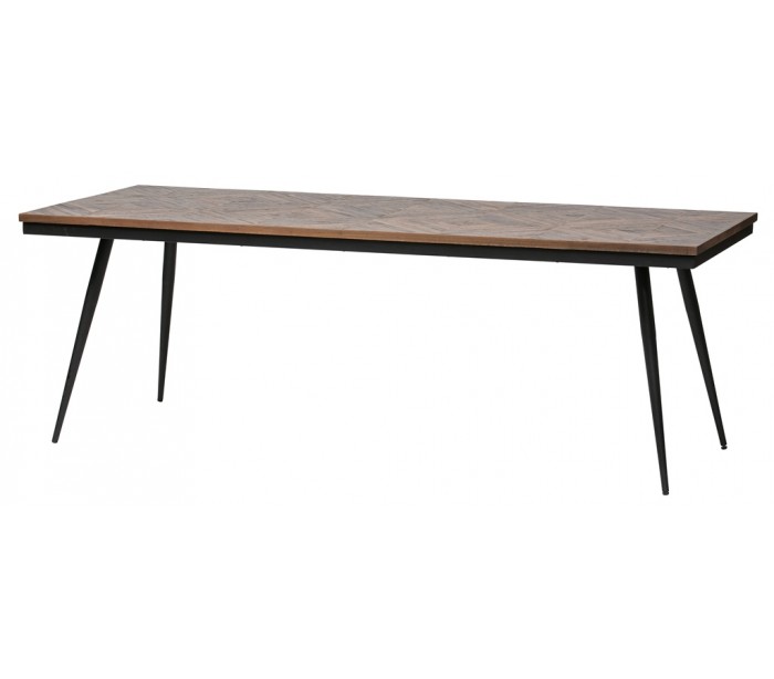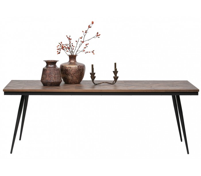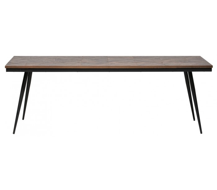 Spisebord i et moderne design, fremstillet med bordplade i naturfarvet genanvendt teaktræ og stel i sortlakeret jern. Bordet måler 76 cm i højden og 220 x 90 cm i bredde og dybde.