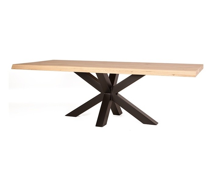 Spisebord i et rustikt design, fremstillet med bordplade i lakeret massivt egetræ og stel i sortlakeret metal. Spisebordet måler 200 x 100 cm i bredde og dybde.
