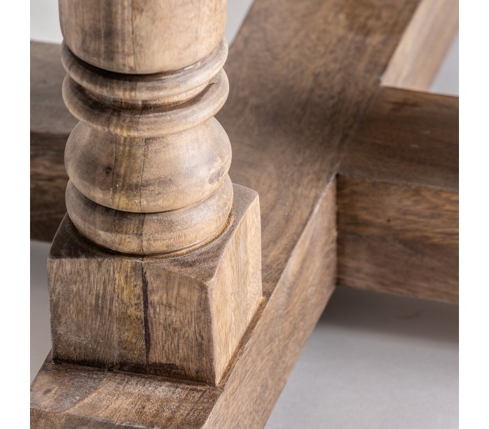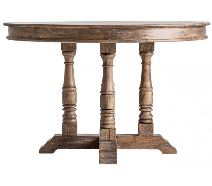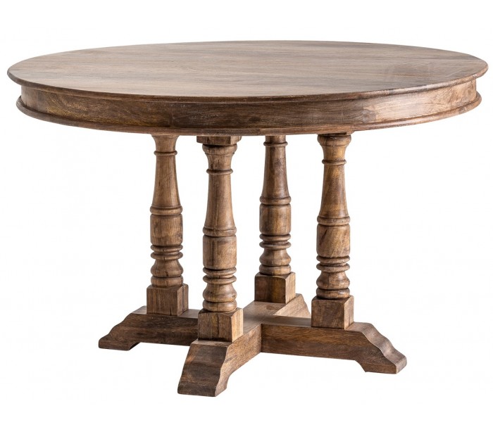 Spisebord i et rustikt design i brun naturfarvet mangotræ. Spisebordet måler 77 cm i højden og 122 cm i diameter.