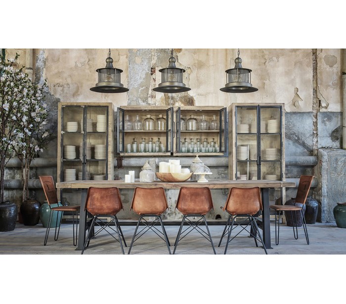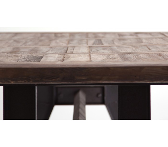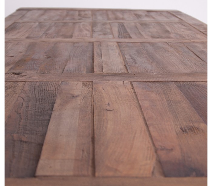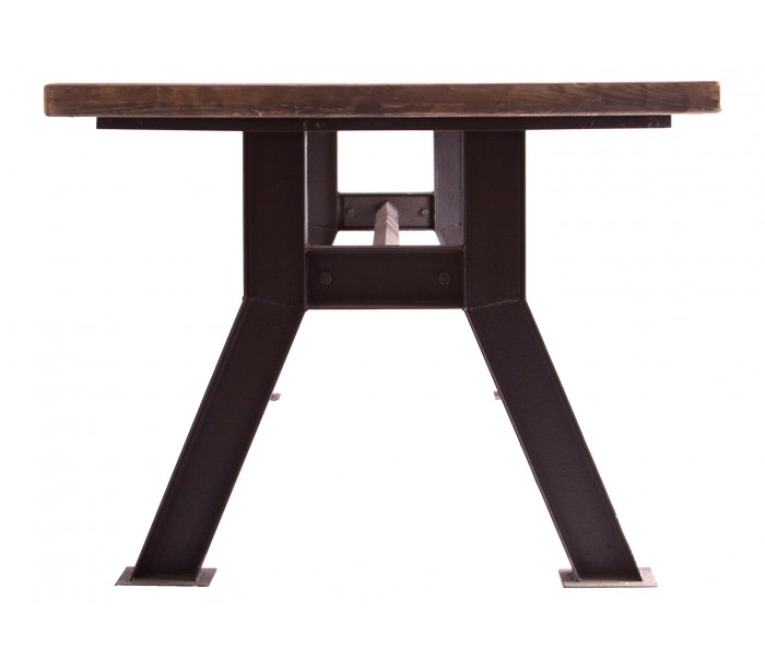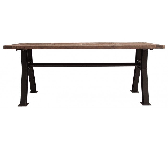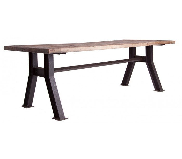 Spisebord i et rustikt design, fremstillet med stel i sortlakeret jern og bordplade i genanvendt fyrretræ. Spisebordet måler 78 cm i højden og 280 x 100 cm i bredde og dybde.