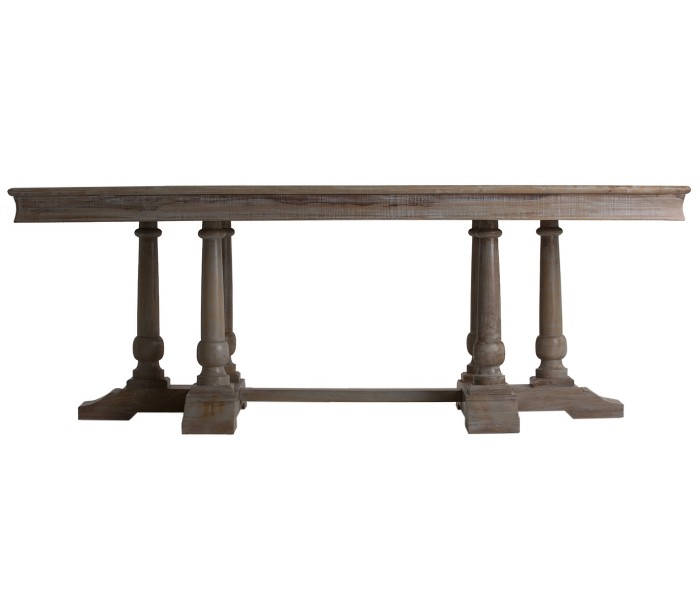 Spisebord i et rustikt design i antik gråbejset mangotræ. Spisebordet måler 76 cm i højden og 213 x 102 cm i bredde og dybde.