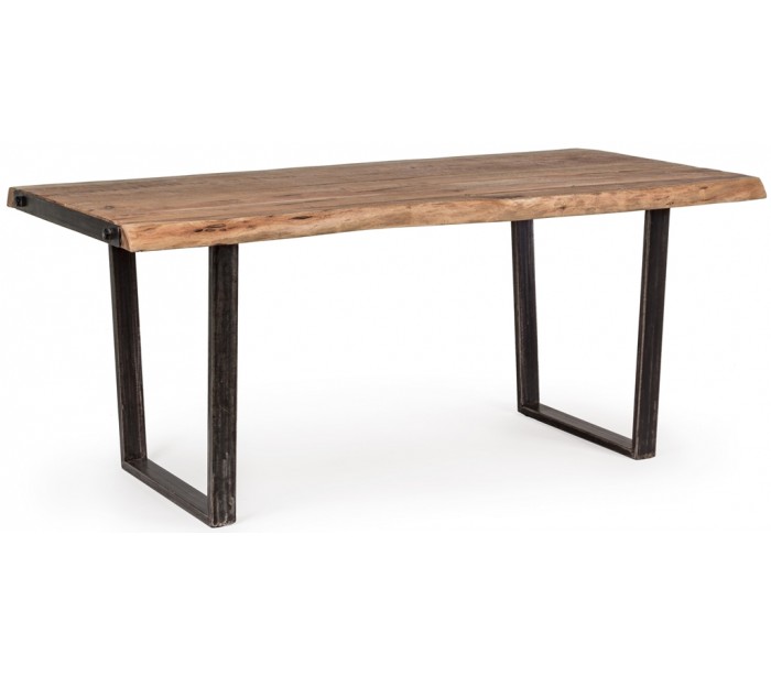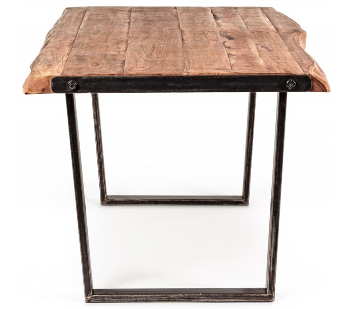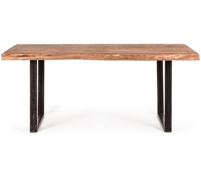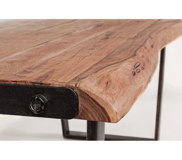 Spisebord i et industrielt design, fremstillet med bordplade i lakeret akacietræ og med stel i industrielt slidt sortlakeret stål. Spisebordet måler 180 x 90 cm i bredde og dybde, og 77 cm i højden.