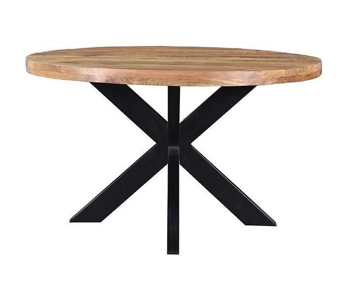 Rundt spisebord i et rustikt design, fremstillet med ben i sortlakeret metal og bordplade i ubehandlet mangotræ. Bordet måler 140 cm i diameter og 76 cm i højden.