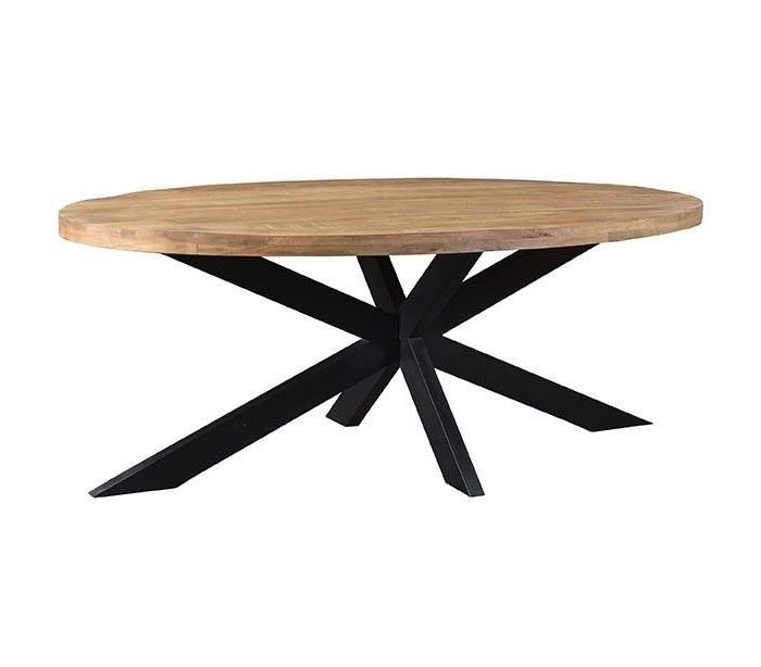 Ovalt spisebord i et rustikt design, fremstillet med ben i sortlakeret metal og bordplade i ubehandlet mangotræ. Bordet måler 240 x 100 cm i bredde og dybde og 76 cm i højden.