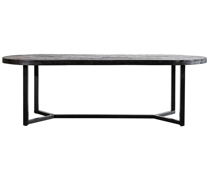 Ovalt spisebord i et rustikt design, fremstillet i sortlakeret mangotræ og sortlakeret metal. Spisebordet måler 76 cm i højden og 200 x 100 cm i bredde og dybde.