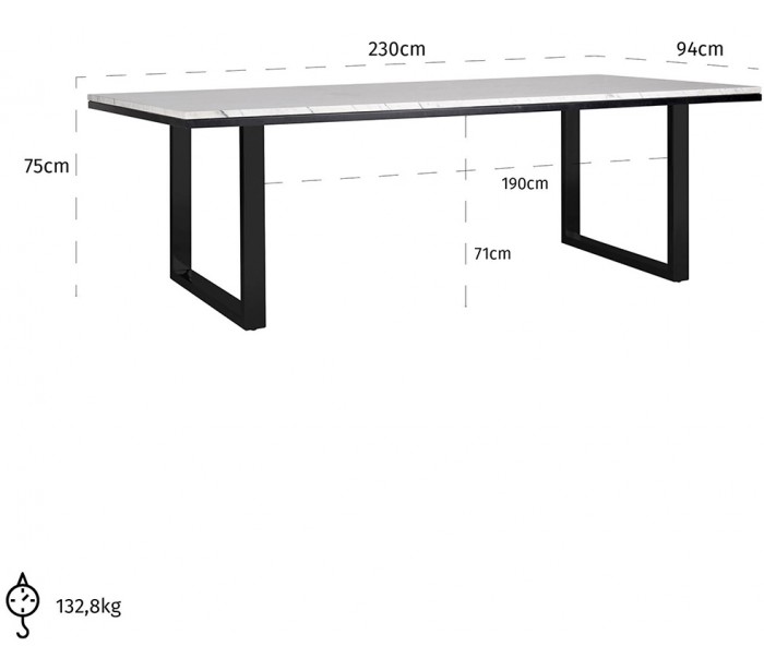 Spisebord i et design fra hollandske Richmond Interiors. Bordet er fremstillet i hvid marmor og sortlakeret jern og måler 230 x 94 cm i bredde og dybde og 75 cm i højden.