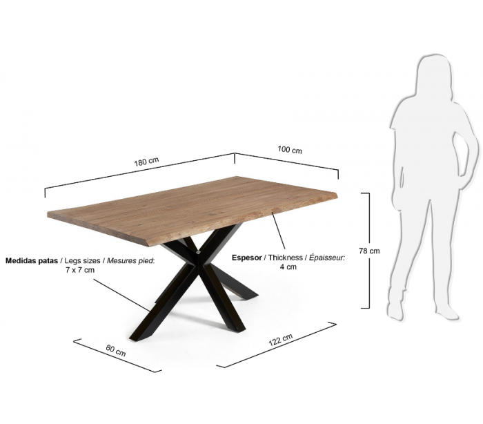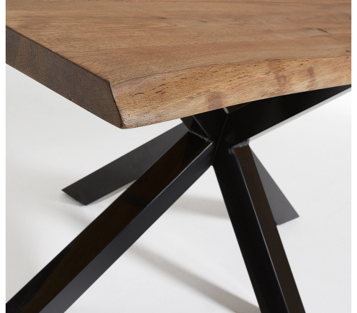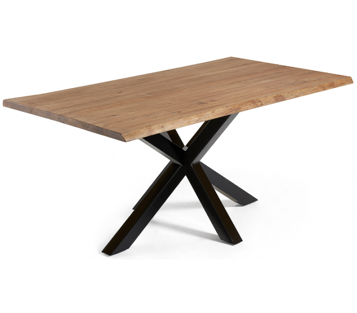 Spisebord i et design fra LaForma. Bordet er fremstillet med stel i sortlakeret stål og med bordplade i massiv lakeret egetræ med naturkant/bølget kant med antikt look. Bordet måler 78 cm i højden og 180 x 100 cm i bredde og dybde.